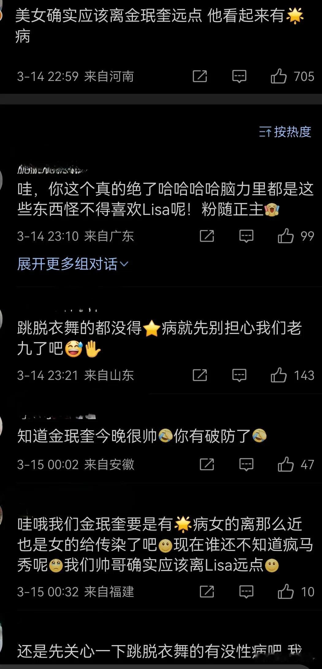 真被网友们的疯狂折服了[捂脸] Lisa和金珉奎同框竟然引发了一场恶战,不得不佩服网友们的脑洞! 话说Lisa抛没抛媚眼跟粉丝有什么关系呢[捂脸]再反过来说就算跟金珉奎抛媚眼了又能怎样? 挣得脸红脖子粗的也不知道费那老劲干啥[笑哭][笑哭]