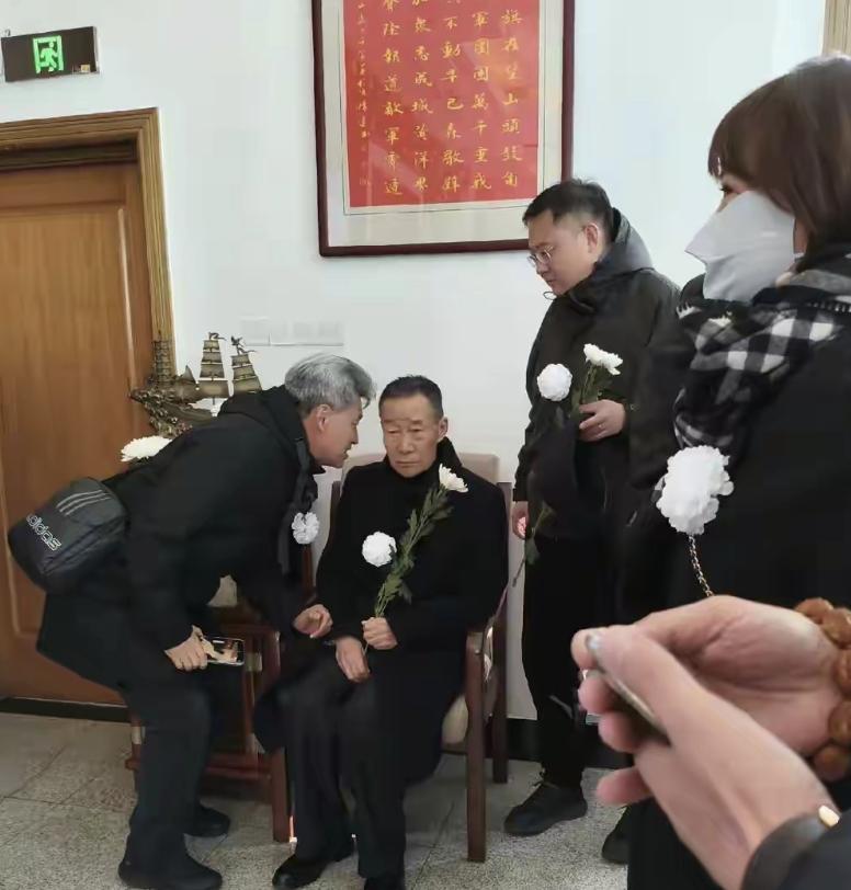 儿子翟小兴处于亲属队列的最前面位置,他身着一身黑西装。