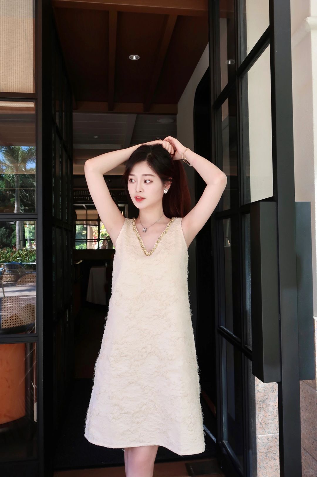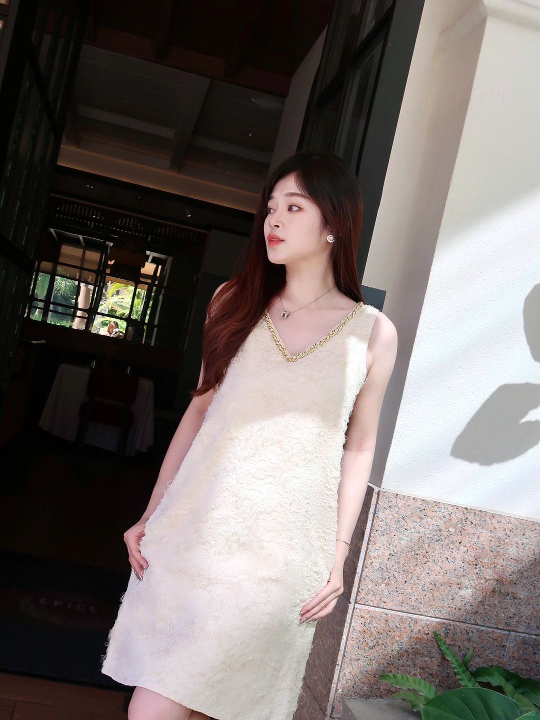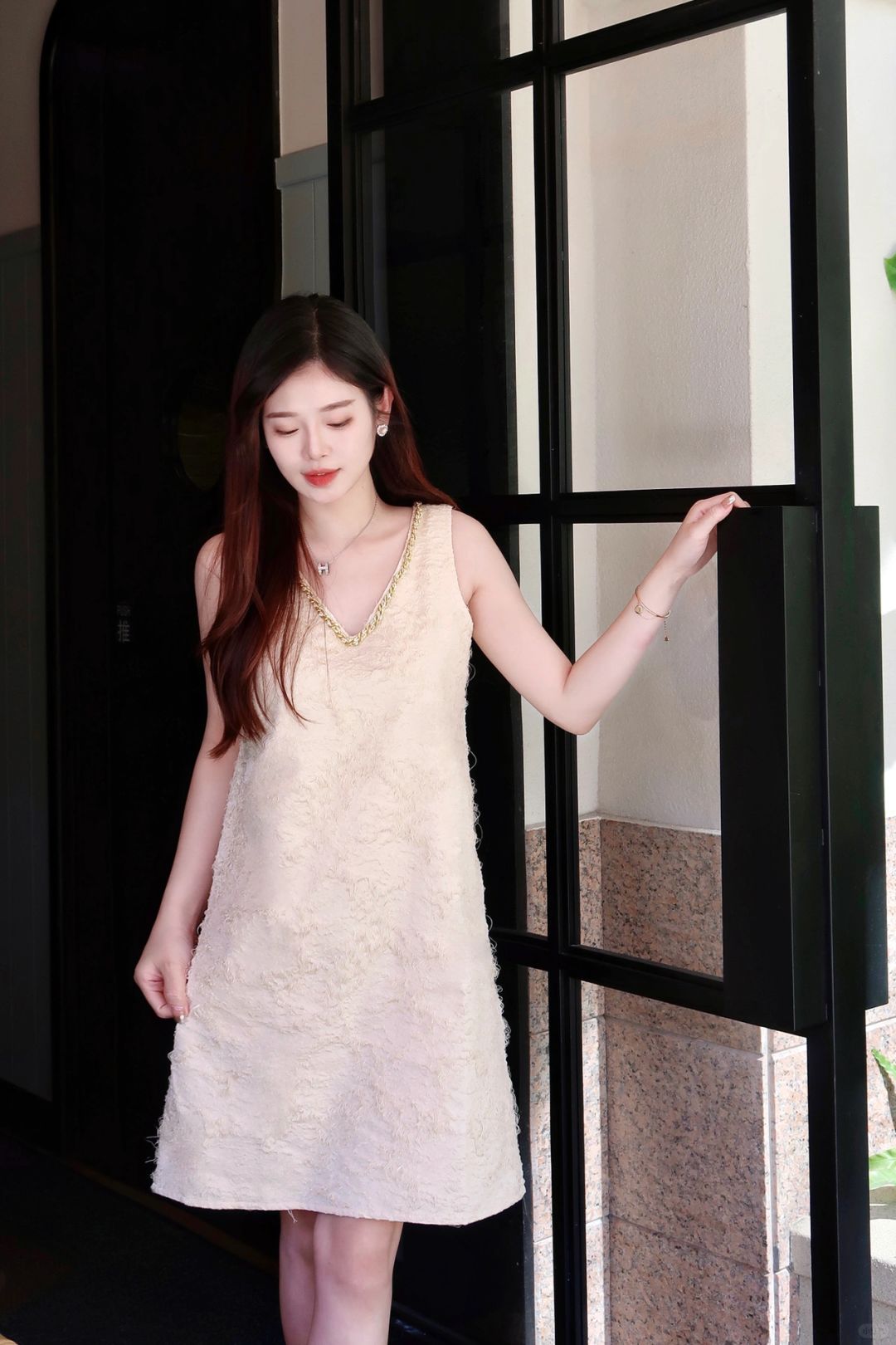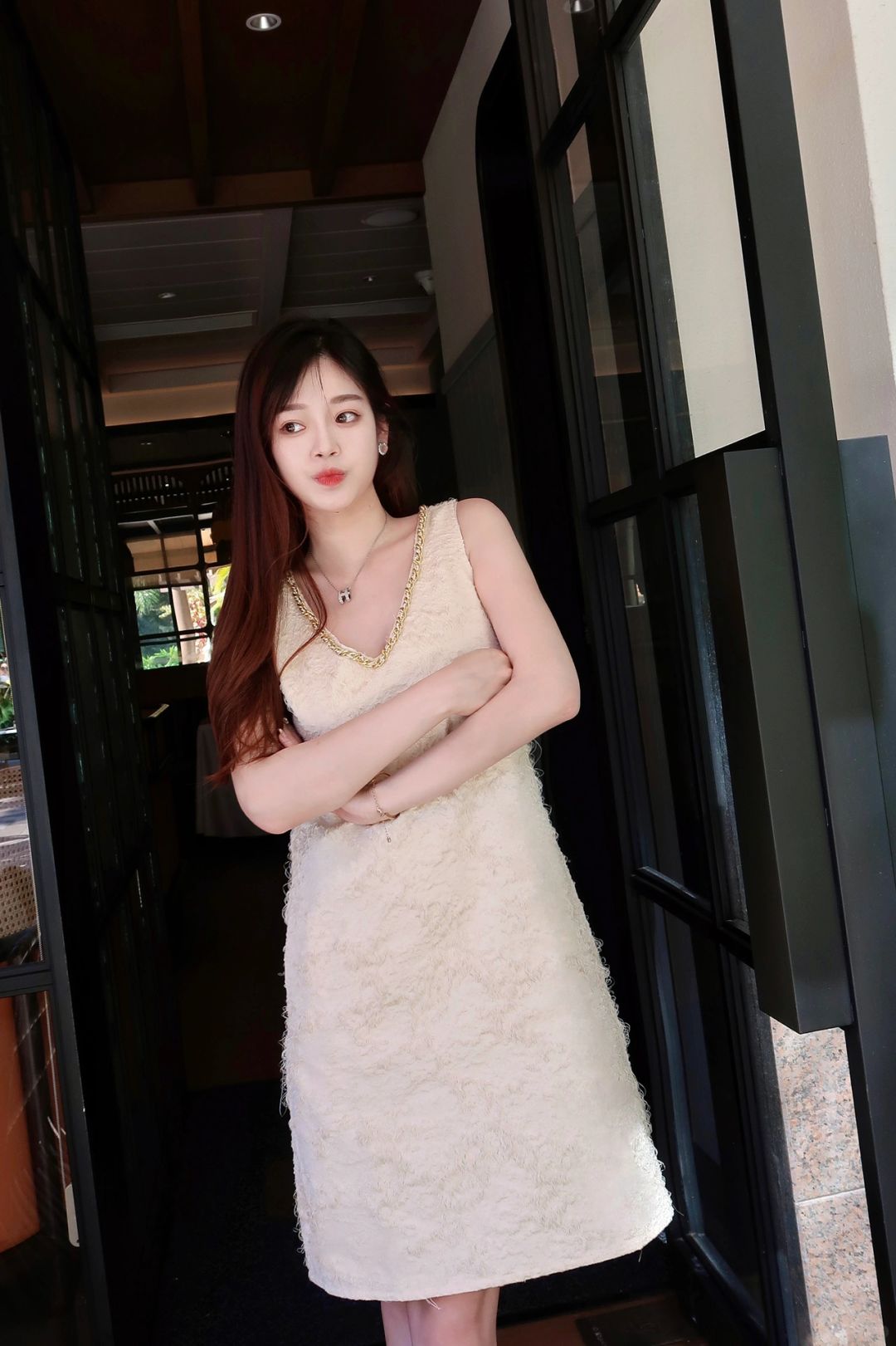 嘻嘻 今天去喝下午茶 被闺蜜要链接的初恋小香风小白裙! 真的很温柔呀~ . V领的设计hin修饰颈部线条 链条⛓的装饰 上身效果很时髦✨ .