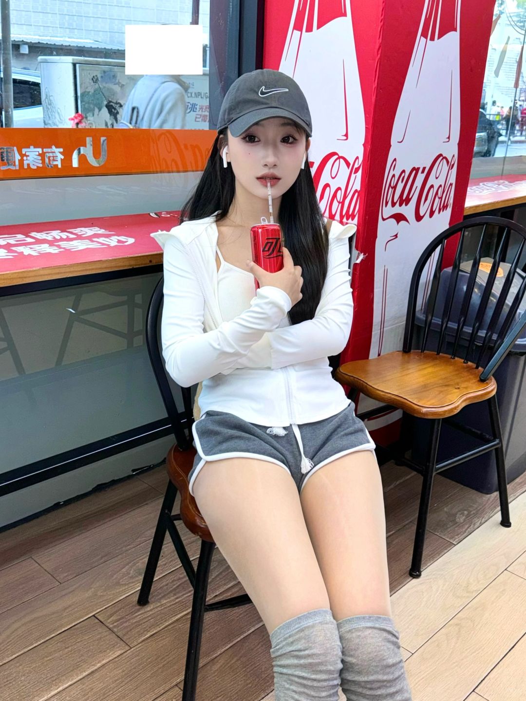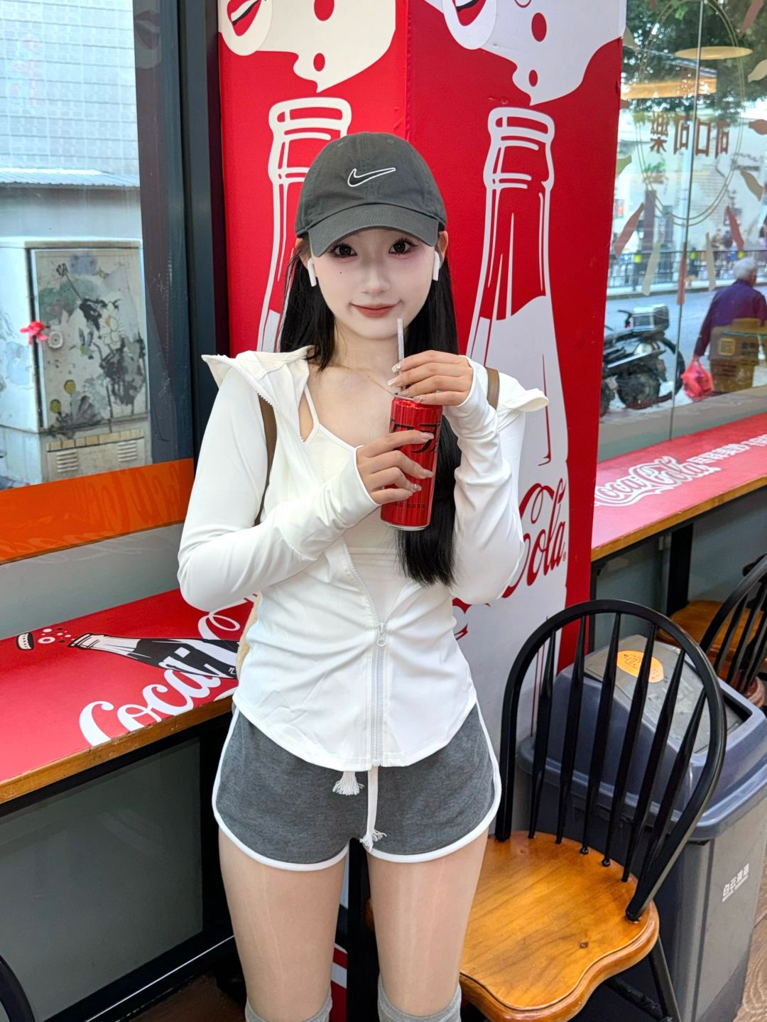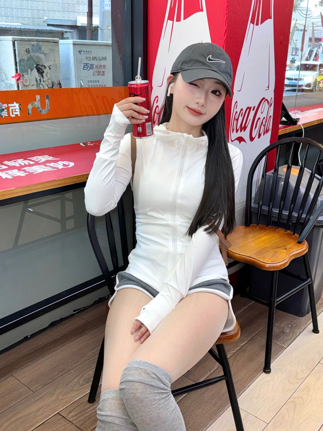 鸭舌帽和修身防晒衣好搭啊 灰色运动短裤和灰色大腿袜 有咩有青春活力那味💖