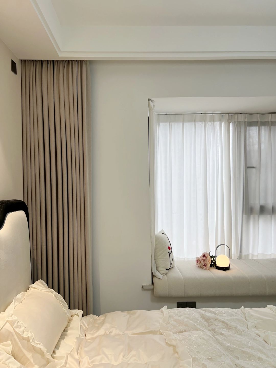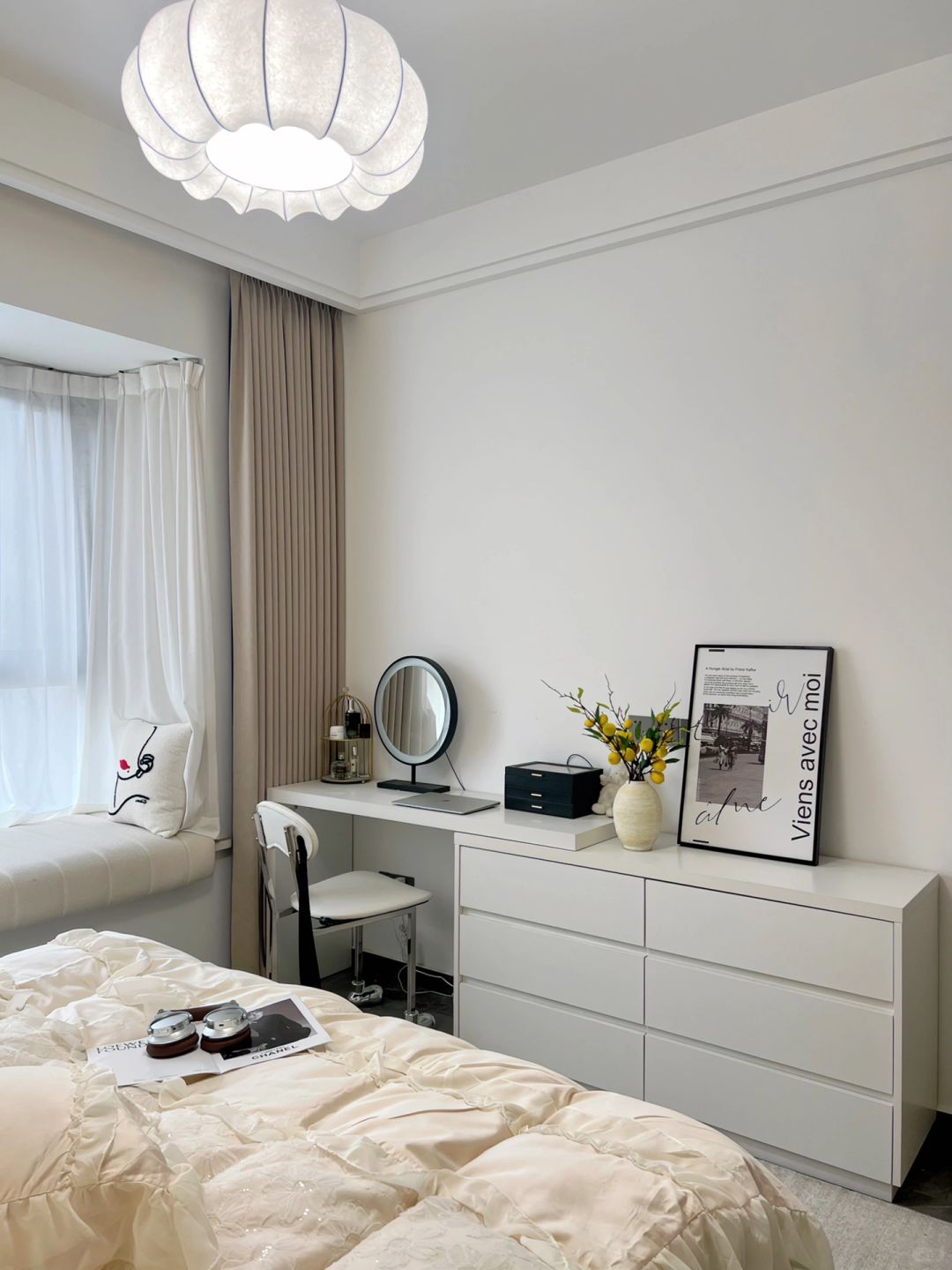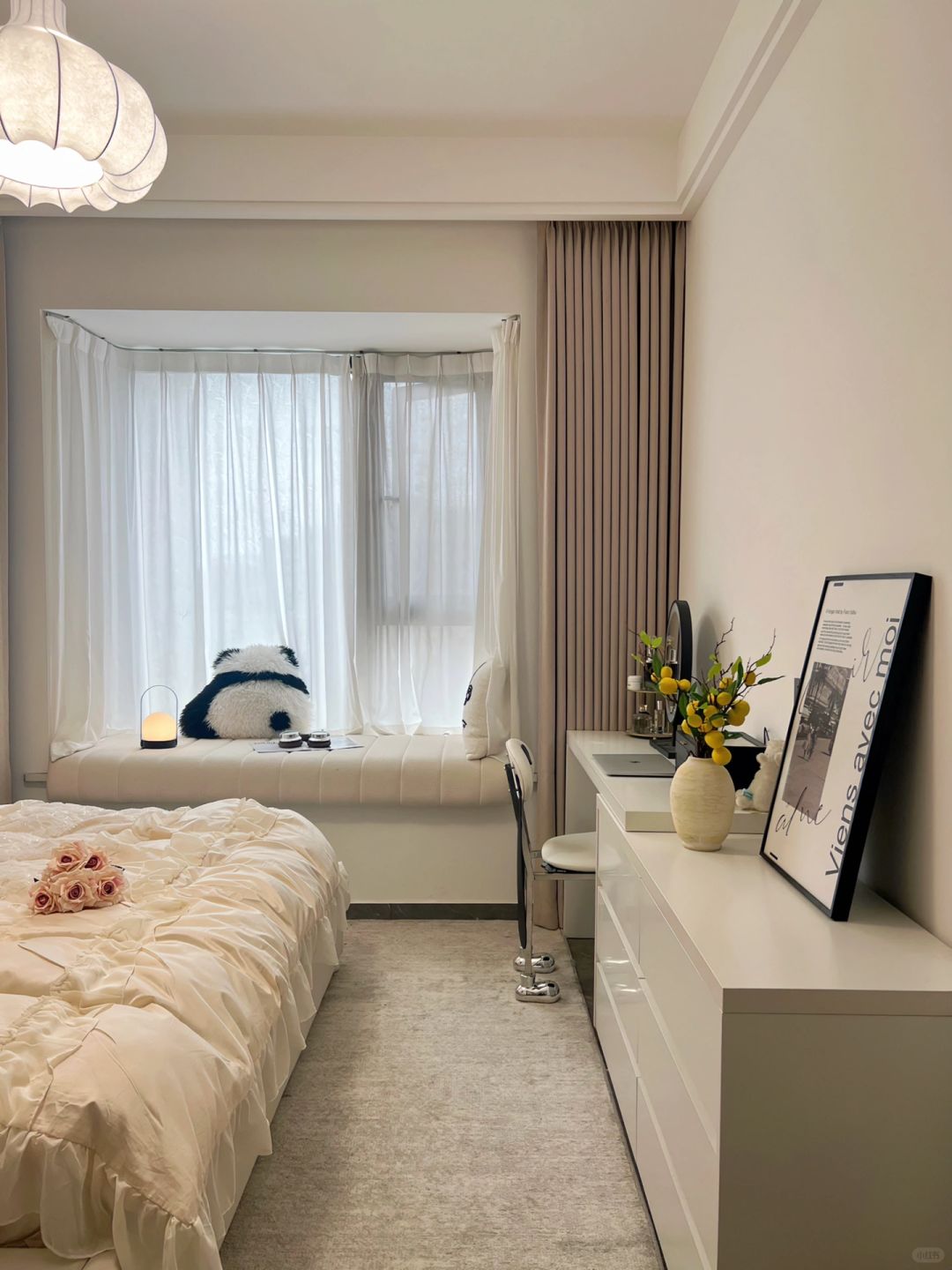 每个女孩都有一个少女梦 婚前住进了儿时梦想的卧室,真的很满足 卧室虽小,但五脏俱全啊~ 背景墙是乳胶漆,搭配双眼皮吊顶 咖色衣柜一门到顶 搭配奶茶色窗帘 一整个温柔风~ 床尾剩余空间1.2m 放了梳妆台斗柜 下班回家在飘窗垫上追追剧 晚上躺床上看看书 刷刷手机 一天的疲惫全没了😌