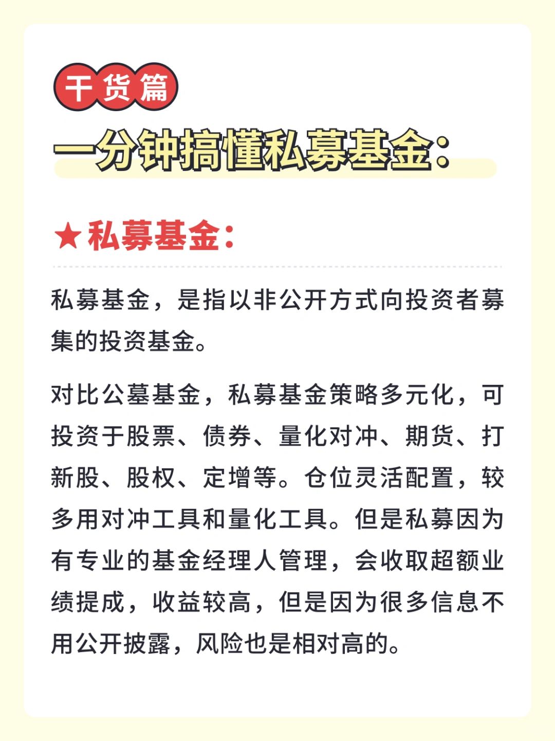 👉 对比公墓基金,私募基金策略多元化,可投资于股票、债券、量化对冲、期货、打新股、股权、定增等。仓位灵活配置,较多用对冲工具和量化工具。但是私募因为有专业的基金经理人管理,会收取超额业绩提成,收益较高,但是因为很多信息不用公开披露,风险也是相对高的。
