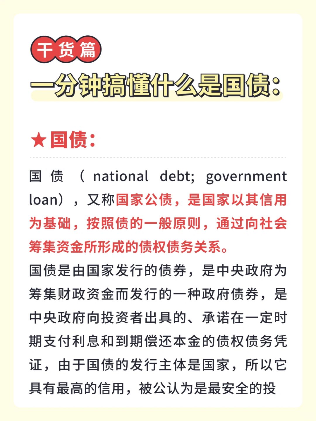 👉 国债(national debt; government loan),又称国家公债,是国家以其信用为基础,按照债的一般原则,通过向社会筹集资金所形成的债权债务关系。