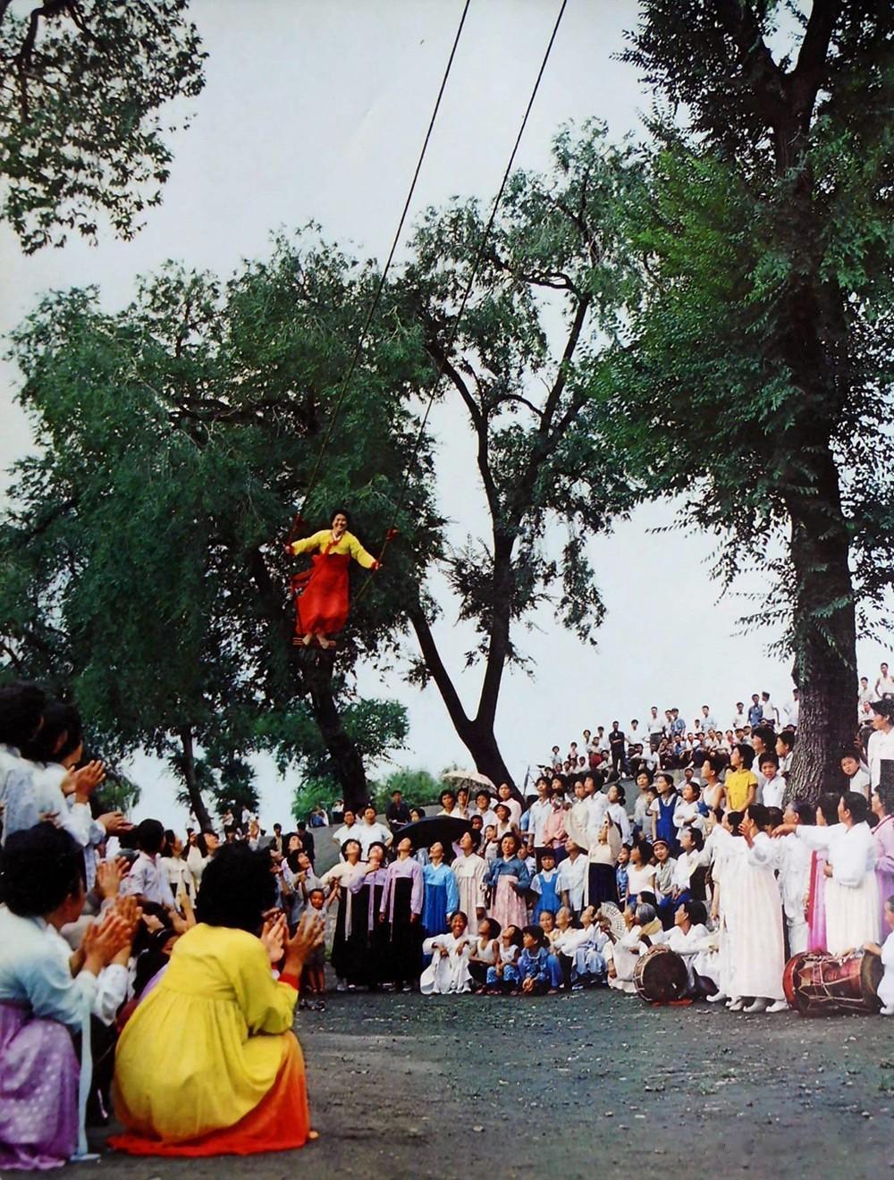 这是另一种体育活动——荡秋千,也是朝鲜族妇女喜爱的运动。秋千越荡越高,精湛的技艺令人惊叹。