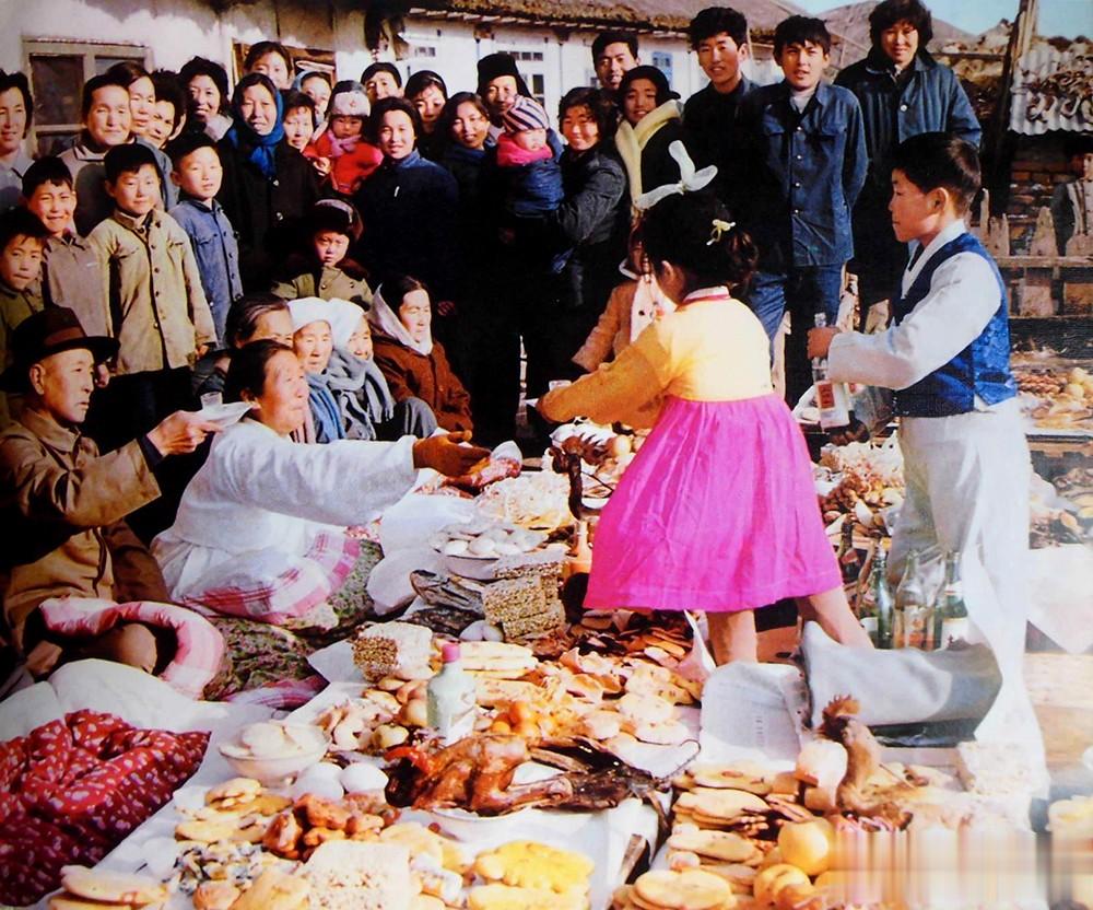 1982年,延边青年结婚时的场景,桌上摆满美食,两位新人正在接受亲朋好友的祝福。
