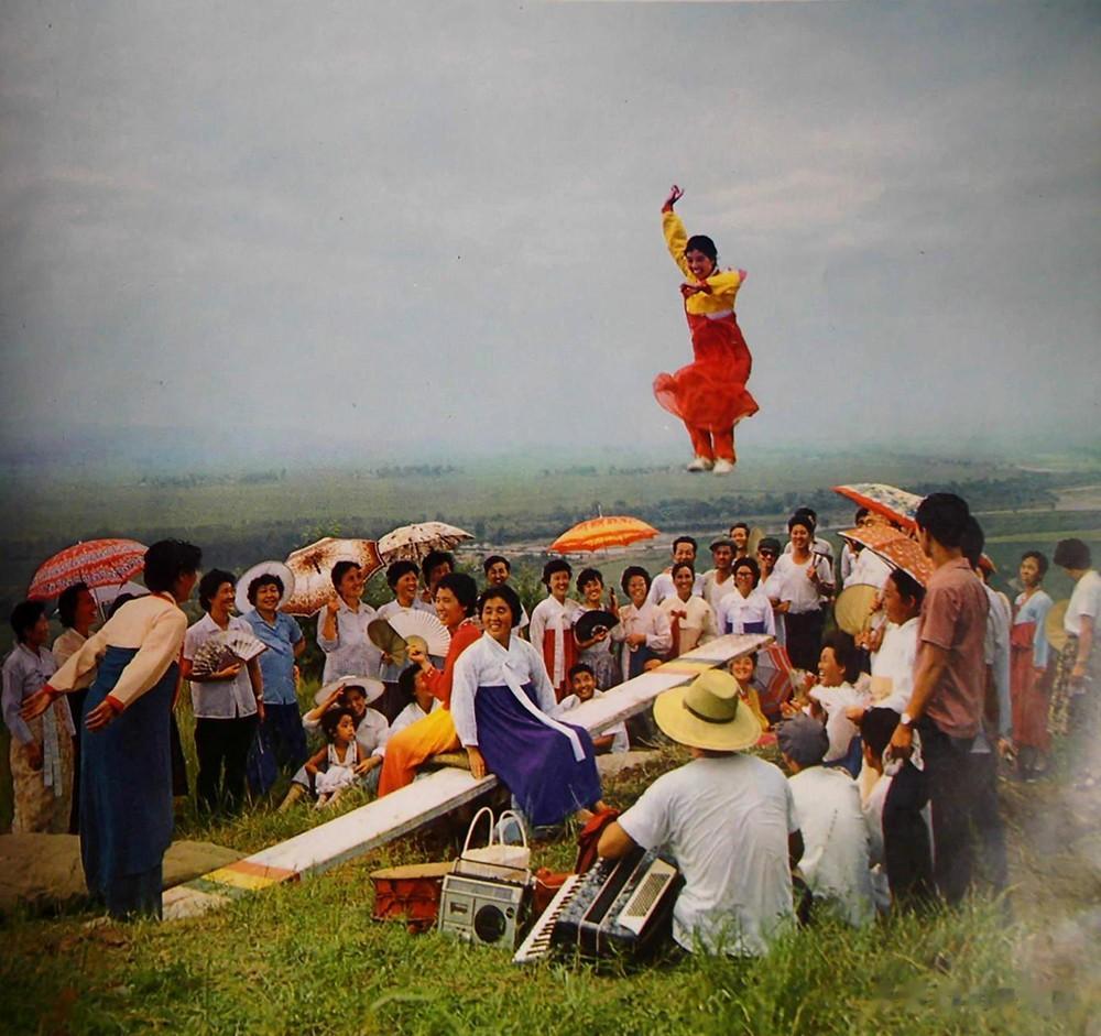 在延边,妇女们正聚集在一起压跳板,现场欢声笑语。压跳板是朝鲜族妇女最喜欢的体育活动之一。