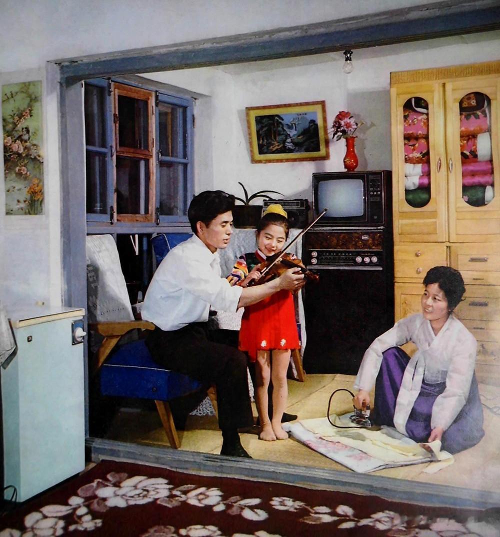 1982年,延边人民的幸福生活。父亲教孩子小提琴,母亲在地上熨衣服。