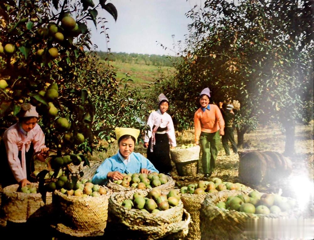 1982年,延边乡下的果园里,果树丰收了,女青年们正在采摘树上的梨子。