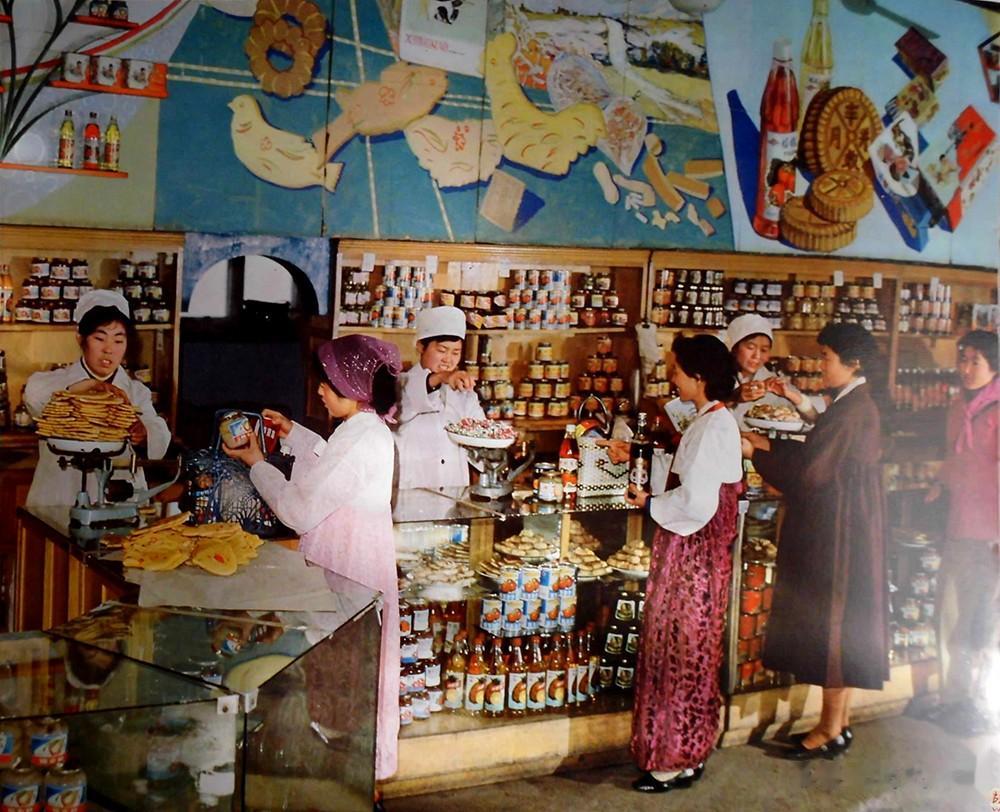 80年代,延边州一家食品商店里,顾客们正在挑选购买美食。