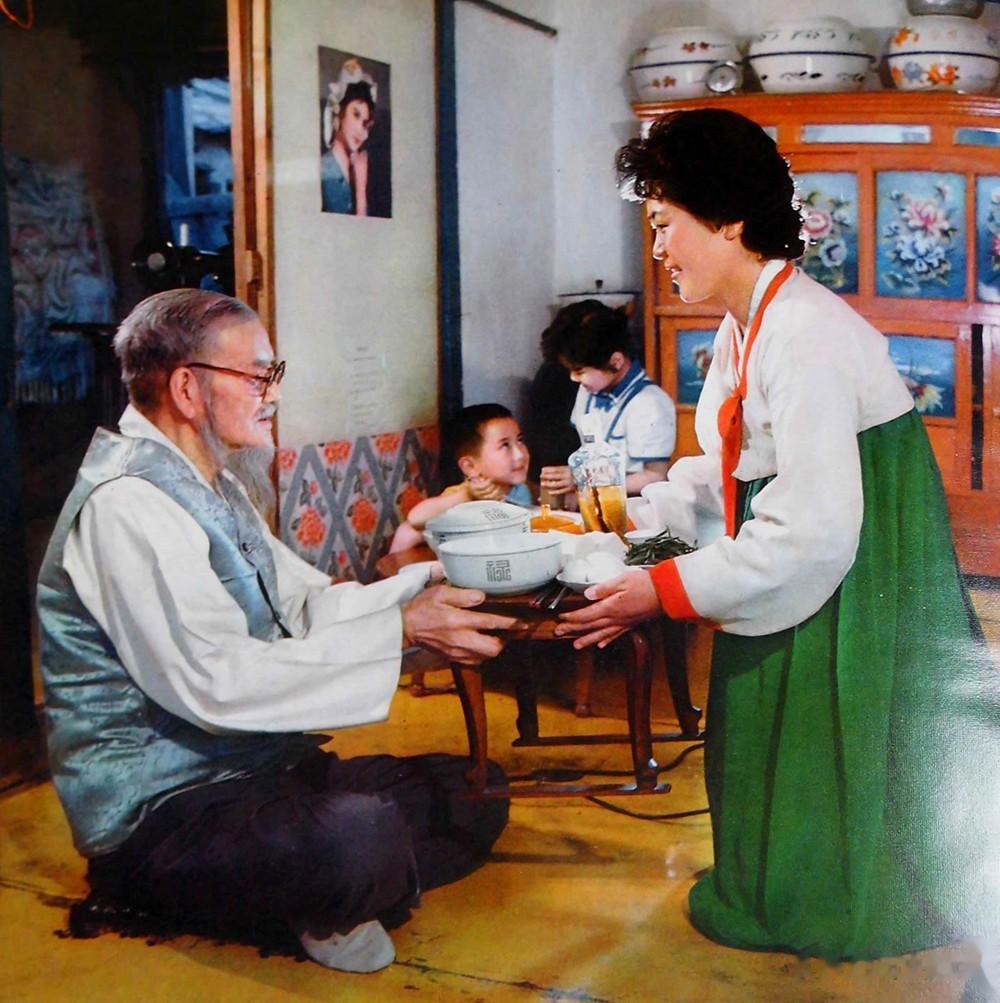 1982年,一位好媳妇,给老公公端来可口的饭菜,老人对儿媳妇非常满意。