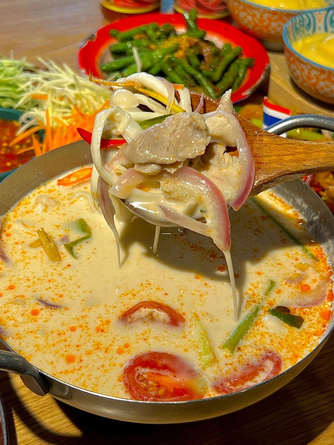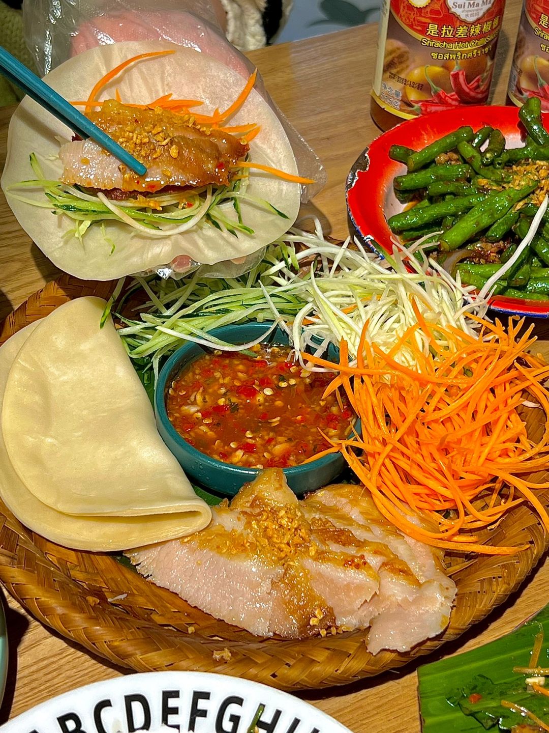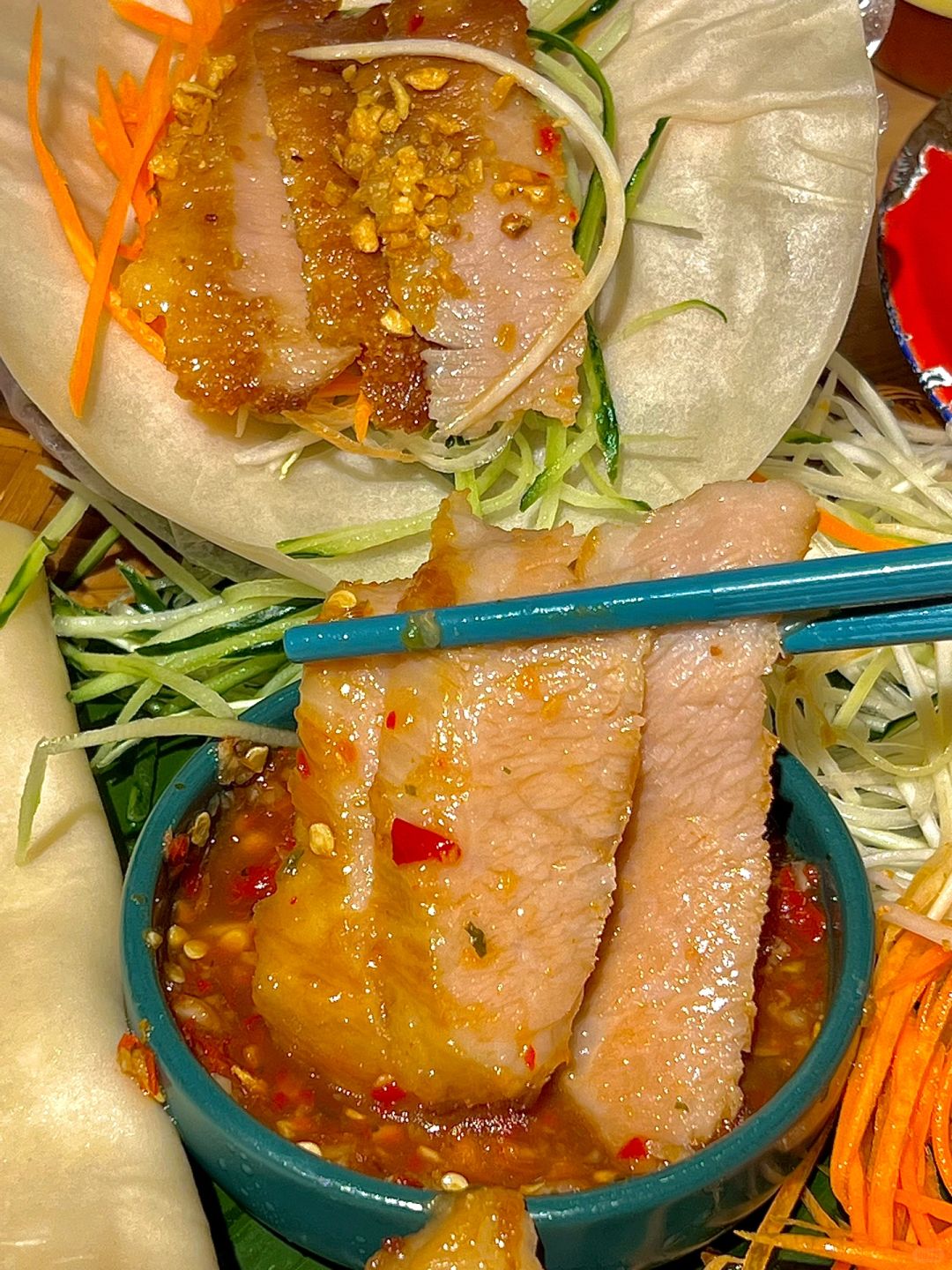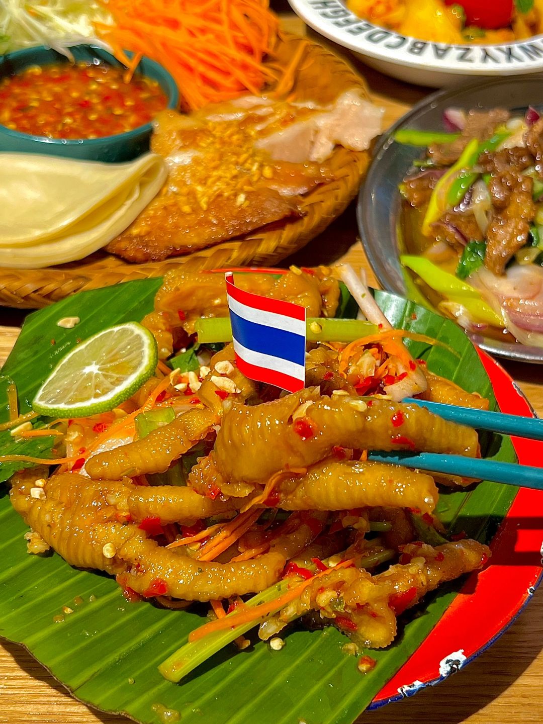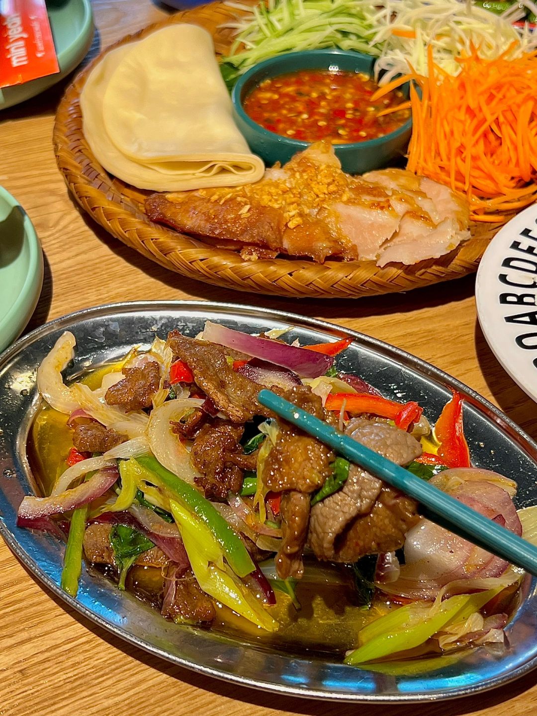 淮海路吃的,满满一桌才129诶!!! 怪不得工作日中午都这么多上班族在吃!!! 🔥炭烧猪颈肉卷卷拼盘 软糯的卷饼➕猪颈肉➕黄瓜丝➕胡萝卜丝 裹上泰式甜辣酱 吃起来甜辣可口~ 🐂马来沙茶爆牛肉 牛肉好嫩!!!用沙茶酱炒的味道好好吃啊 我还另外加了个榴莲捞奶,榴莲的味道尊嘟hin浓郁!!!嘎嘎好吃👍