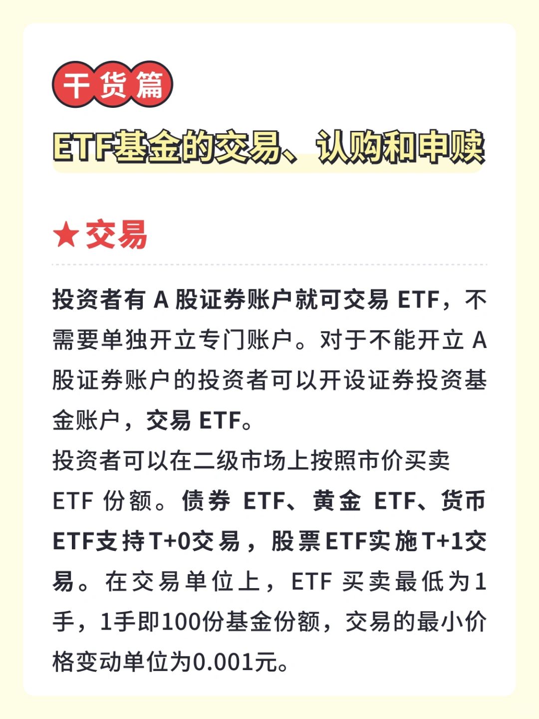 投资者可以在二级市场上按照市价买卖 ETF 份额。债券 ETF、黄金 ETF、货币 ETF支持T+0交易,股票ETF实施T+1交易。在交易单位上,ETF 买卖最低为1手,1手即100份基金份额,交易的最小价格变动单位为0.001元。