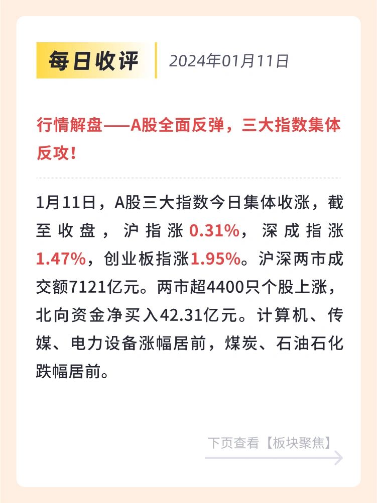 👉 1月11日,A股三大指数今日集体收涨,截至收盘,沪指涨0.31%,深成指涨1.47%,创业板指涨1.95%。沪深两市成交额7121亿元。两市超4400只个股上涨,北向资金净买入42.31亿元。计算机、传媒、电力设备涨幅居前,煤炭、石油石化跌幅居前。
