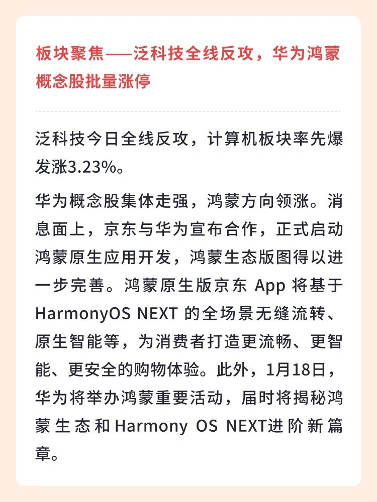 👉 华为概念股集体走强,鸿蒙方向领涨。消息面上,京东与华为宣布合作,正式启动鸿蒙原生应用开发,鸿蒙生态版图得以进一步完善。鸿蒙原生版京东 App 将基于HarmonyOS NEXT 的全场景无缝流转、原生智能等,为消费者打造更流畅、更智能、更安全的购物体验。此外,1月18日,华为将举办鸿蒙重要活动,届时将揭秘鸿蒙生态和Harmony OS NEXT进阶新篇章。