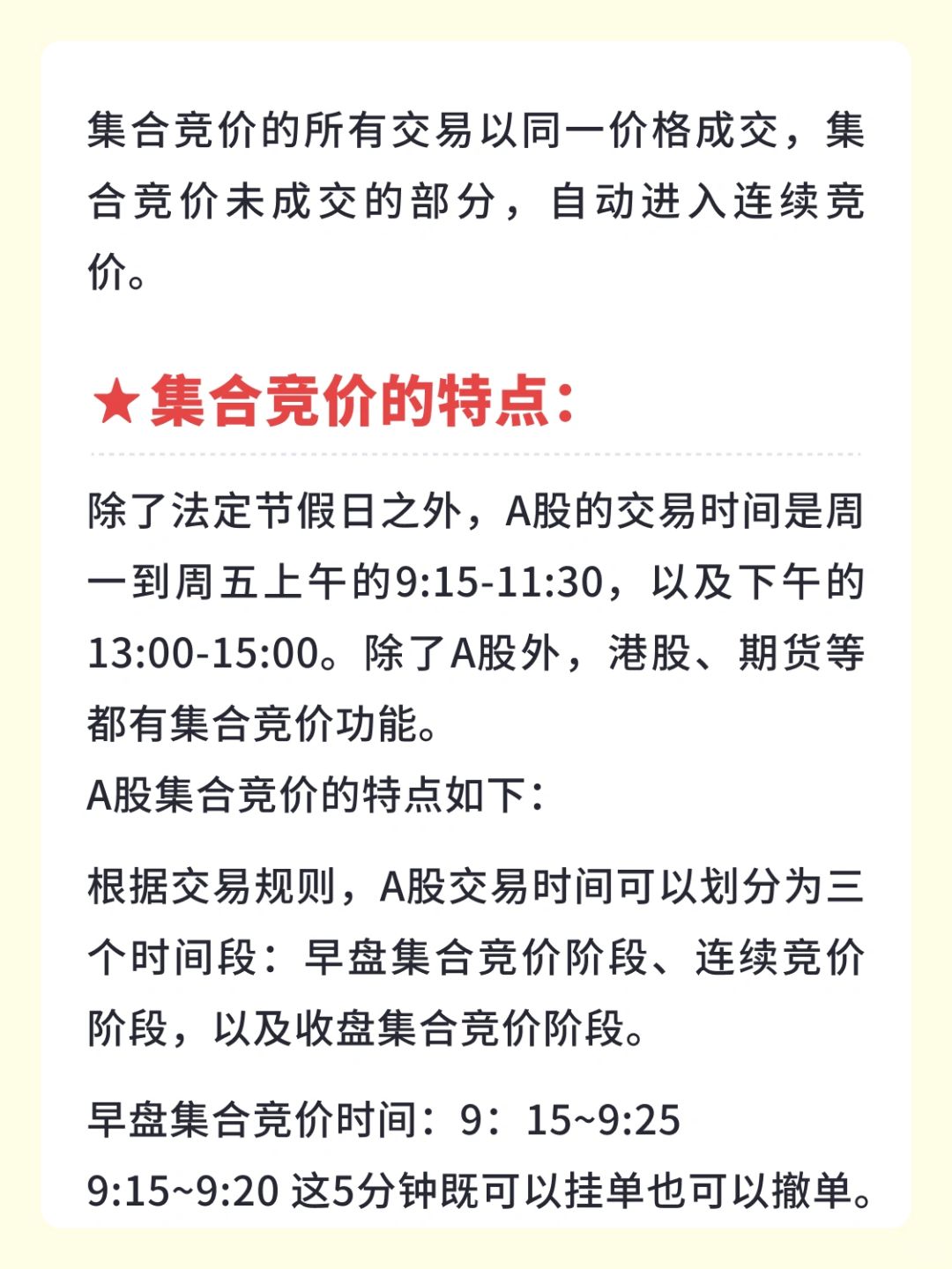 👉 除了法定节假日之外,A股的交易时间是周一到周五上午的9:15-11:30,以及下午的13:00-15:00。除了A股外,港股、期货等都有集合竞价功能A股集合竞价的特点如下: