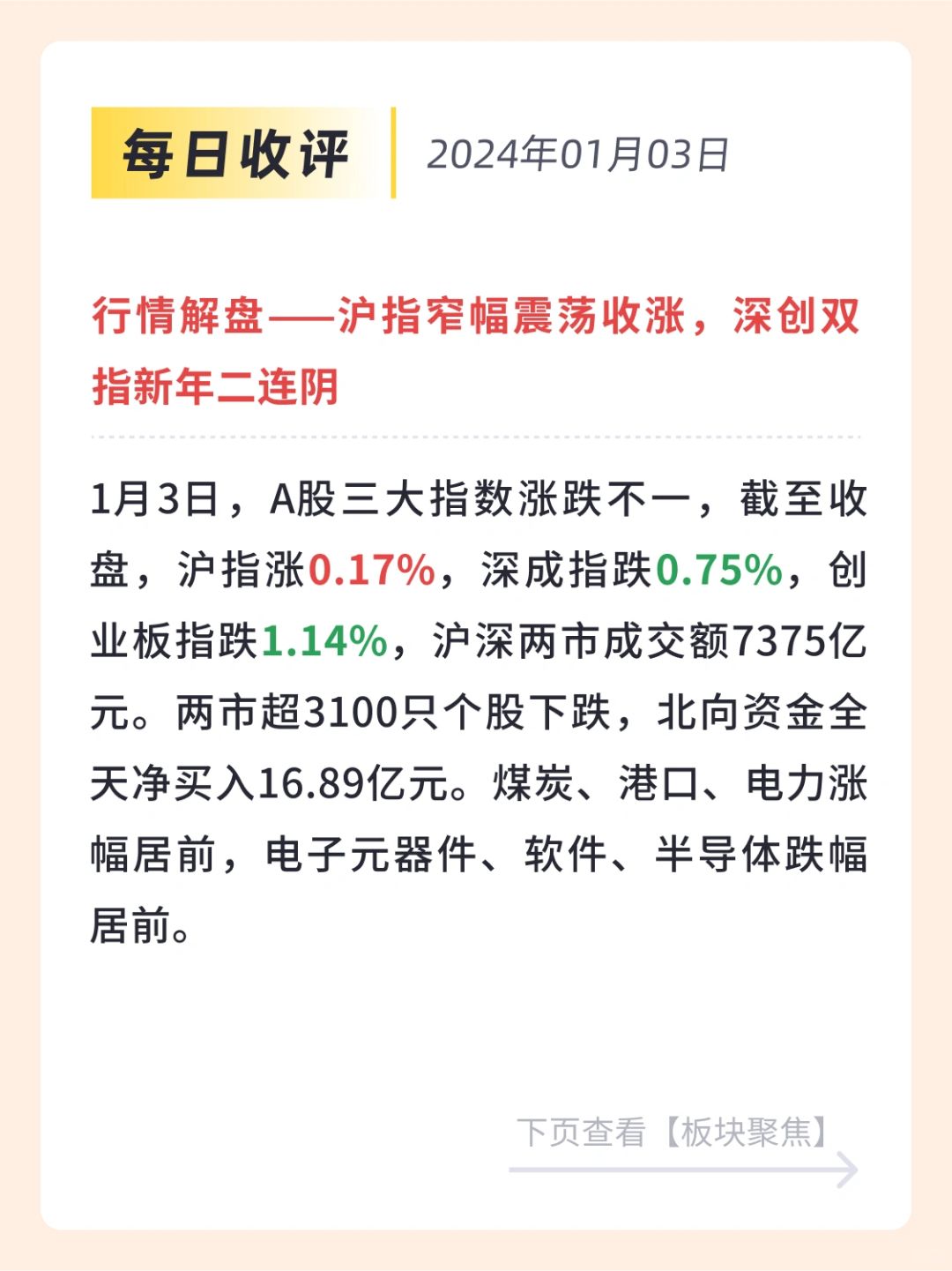 👉 1月3日,A股三大指数涨跌不一,截至收盘,沪指涨0.17%,深成指跌0.75%,创业板指跌1.14%,沪深两市成交额7375亿元。两市超3100只个股下跌,北向资金全天净买入16.89亿元。煤炭、港口、电力涨幅居前,电子元器件、软件、半导体跌幅居前。