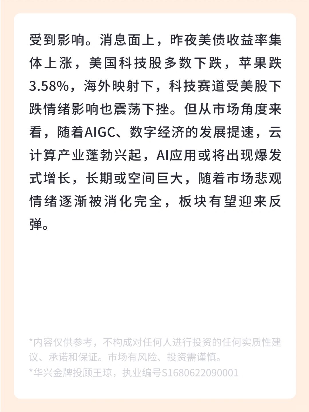 👉 科技赛道大跌,半导体、计算机等板块均受到影响。消息面上,昨夜美债收益率集体上涨,美国科技股多数下跌,苹果跌3.58%,海外映射下,科技赛道受美股下跌情绪影响也震荡下挫。但从市场角度来看,随着AIGC、数字经济的发展提速,云计算产业蓬勃兴起,AI应用或将出现爆发式增长,长期或空间巨大,随着市场悲观情绪逐渐被消化完全,板块有望迎来反弹。