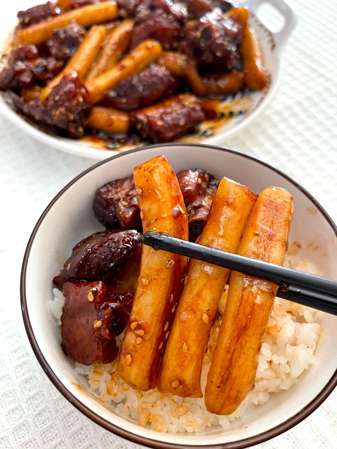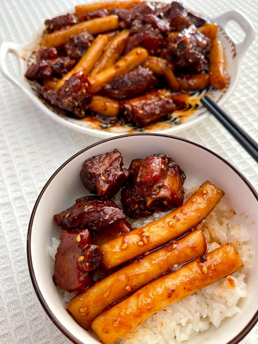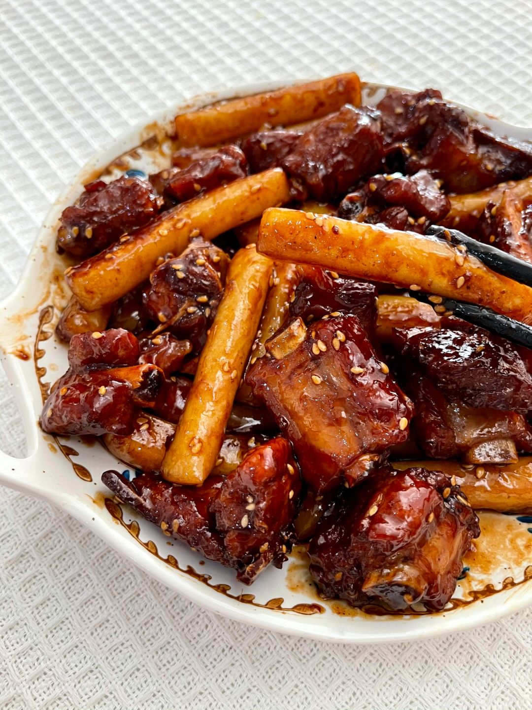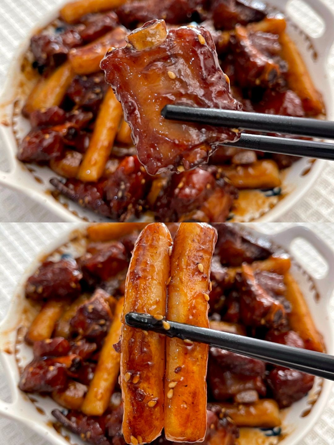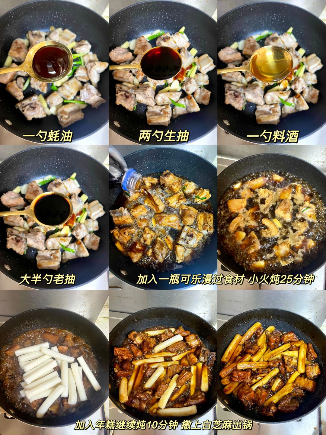 巨巨巨爱吃的可乐年糕排骨!! 这么做出来真的泰香啦~ 软烂脱骨的排骨 软糯软糯的年糕 浓郁的汤汁拌饭超入味…!!真的一绝! - ☑️排骨➕料酒、姜片焯水捞出洗净备用 ☑️锅里炒出糖色 倒入排骨翻炒上色 ☑️加两勺生抽、半勺老抽、一勺蚝油、一勺料酒,翻炒均匀,加入一瓶可乐 ☑️中小火炖煮半小时以后加入年糕继续煮三分钟,撒白芝麻出锅~