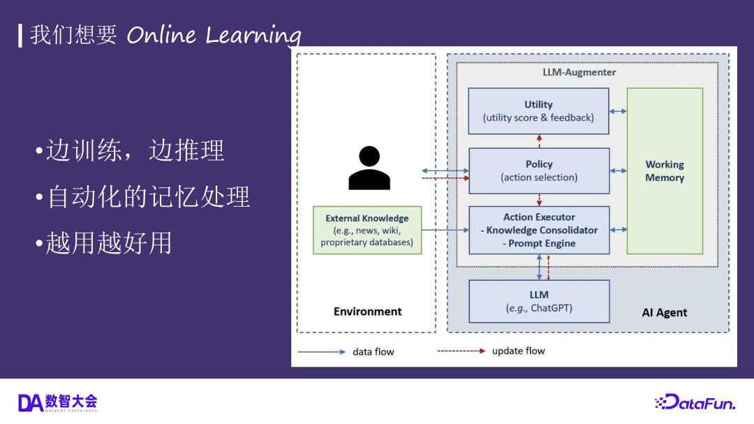 Online Learning 是指在模型推理过程中同步进行训练和反馈。预训练阶段仍然必不可少,但在实际应用时,当外部需求或新知识输入后,系统会通过特定机制(如上图中红线所示)实时修改大模型的权重。这样,新知识就能被真正内化到模型中。