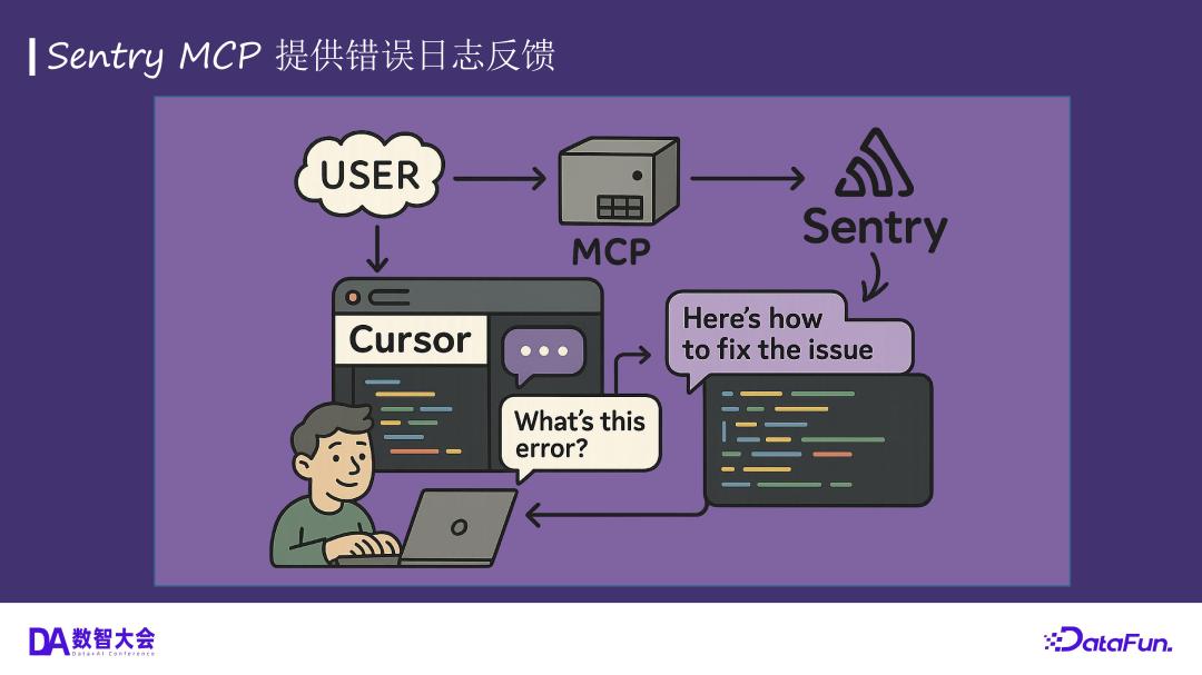 错误日志是反馈机制的关键环节。以 Sentry 为例,它在 MCP 技术推出时就迅速适配,提供了官方支持工具。但目前,许多团队仍未将日志系统深度整合到工作流中,尤其是未让 AI 利用这些错误日志。如果实现完整对接,AI 的表现将大幅提升。