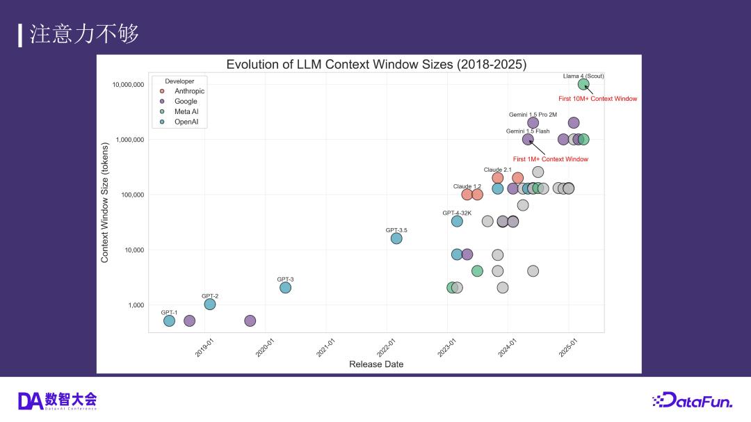 核心问题在于:2022 至 2023 年间,当上下文长度限制凸显后,各大厂商纷纷扩展上下文容量,目前已达 10M token(约 1000 万 token,相当于一本巨著)。但大模型表现不佳(难以完成复杂任务或产出高质量内容)的根本原因存在认知偏差: