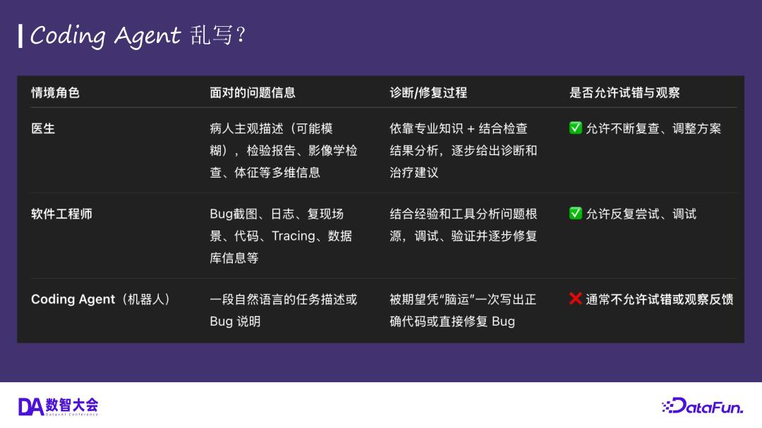 目前 Coding Agent 已能处理简单问题(如根据错误日志修复后端接口报错),但用户不满的核心在于复杂场景:仅凭日志无法解决的问题,或是性能优化等需要全局视角的任务。这时就需要反思:我们是否提供了足够全面的信息?是否配备了充分的验证和测试工具?