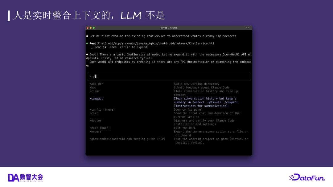 这体现了人类与 AI 的核心差异:AI 虽具备长上下文处理能力,但缺乏智能筛选关键信息的能力。Claude Code 为此提供了 Compact 命令来摘要长文本,但摘要过程难免丢失重要信息。