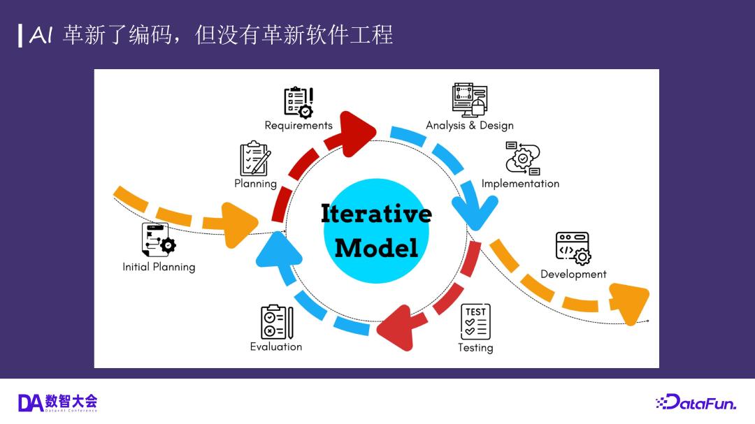 但目前 AI 对整个软件开发链条的冲击是局部的、碎片化的,而非系统性变革。即便在单个环节的应用,也仍然需要人工参与和监督。这就是当前典型的软件迭代过程中 AI 的应用现状。