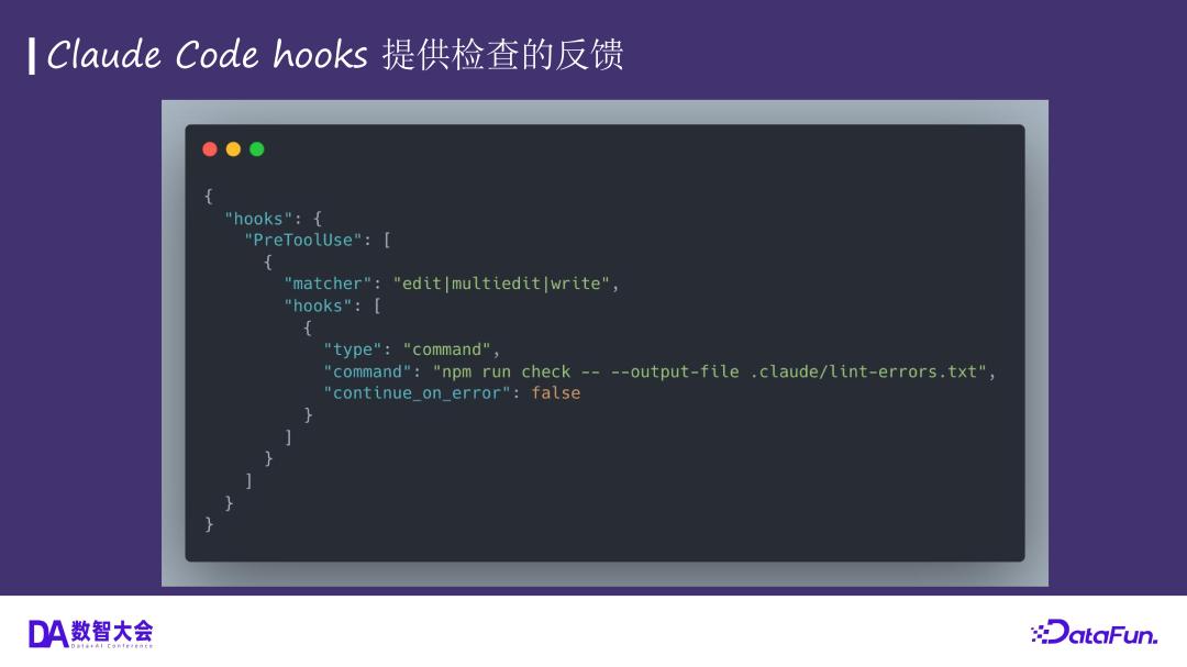测试并非唯一的反馈方式。Claude Code 近期新增的 hooks 功能,本质上也是为模型提供反馈机制。它允许模型在使用外部工具或编写代码时执行外部命令并获取结果。例如我们团队配置的 team run check 就包含这些内容:Lint 检查(几乎所有团队都会用)、ES 规范要求,以及我们内部特有的规范(如代码行数限制、注释格式等)。