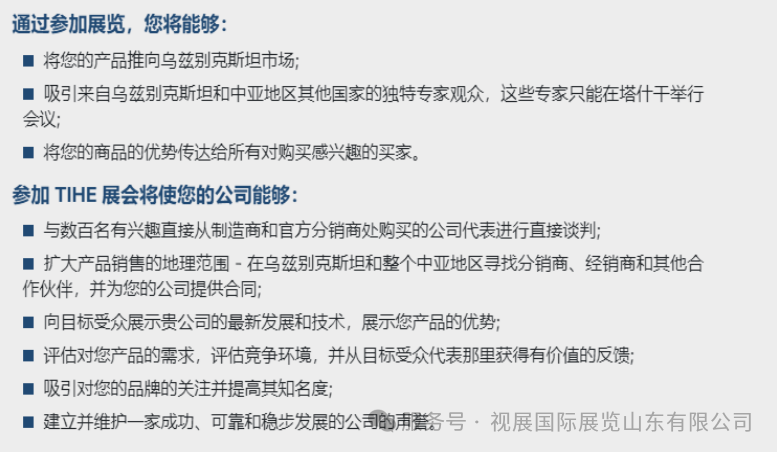 第 29 届 TIHE(乌兹别克斯坦国际医疗展)与 STOMATOLOGY UZBEKISTAN(乌兹别克斯坦国际口腔展)和 PHARM EXPO CENTRAL ASIA(乌兹别克斯坦国际原料药展)同期举办,是中亚地区知名的专业医疗展览会,它极大的促进了乌兹别克斯坦及中亚地区医疗、口腔、原料药行业的发展,还使中亚成为最具有发展潜力的市场之一。