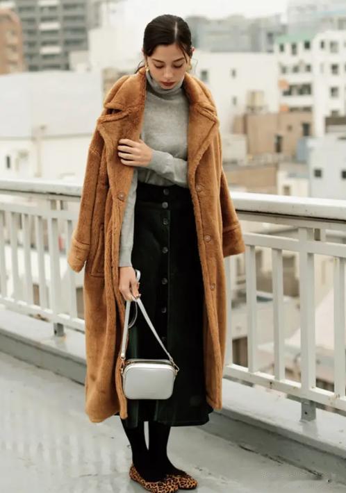 棕色长款羊羔绒配灰色打底衫配黑色半身裙,长款羊羔绒的保暖王者地位不容置疑。长款设计能更好地抵御寒风侵袭,灰色内搭低调有质感不抢风头。黑色半身裙增添女性魅力,同时保持了整体色调的和谐统一。
