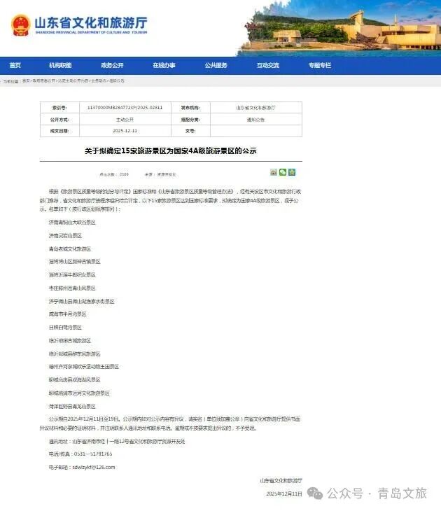 近日,山东省文化和旅游厅发布《关于拟确定15家旅游景区为国家4A级旅游景区的公示》,全省15家景区拟确定为国家4A级旅游景区,备受关注的青岛老城文化旅游区在列。