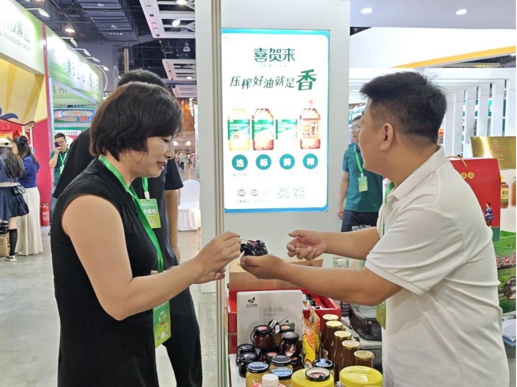 展区内,河北辣都食品有限公司带来的辣椒酱、辣椒面等系列辣椒制品,以及河北御香坊食品有限公司的火锅底料,充分体现了望都辣椒产业的深厚底蕴;河北龙河面业有限公司的挂面与刀削面产品,依托本地高筋小麦原料和零添加工艺,兼具口感与品质;保定壮园树农业有限公司的文冠果油富含不饱和脂肪酸,成为健康食用油的新选择;保定市味丰食品有限公司的黄桃罐头、乌梅楂楂、果酱及黄桃果咖等水果制品,也以新鲜口感和天然风味获得广泛好评。各类产品以其优良品质和地域特色,吸引了众多参展观众和采购商驻足咨询。