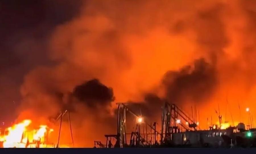 火灾发生在11月27日晚,火光瞬间点亮了宁静的海港。燃烧的木质渔船在火光中摇曳,火势迅速蔓延,起火的原因正在调查中。据现场目击者描述,起火的船只多为木船,煤气罐和柴油在火中喷涌而出,火势异常凶猛。那一夜,码头停靠着上百艘渔船,火光映红了半边天,场面一度十分危急。