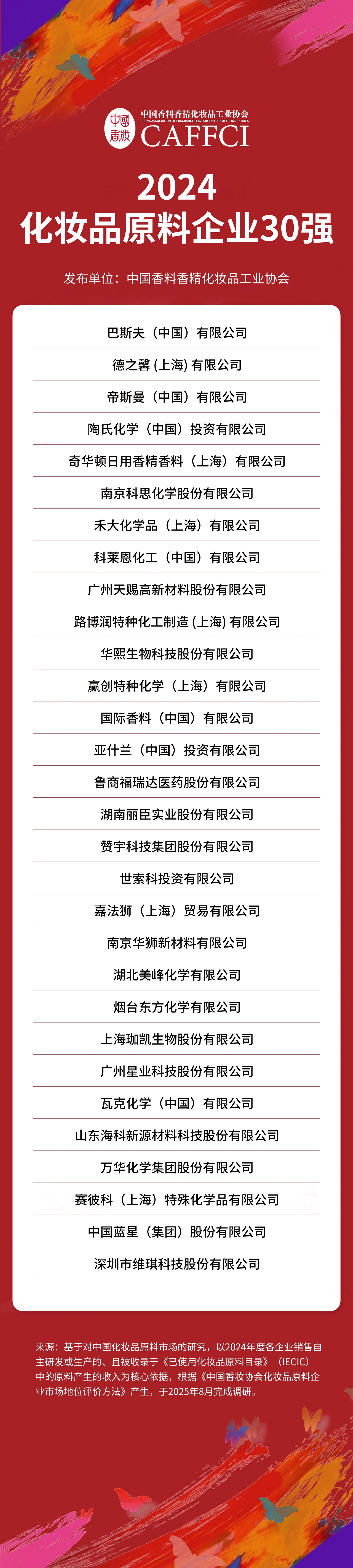 本次 30 强评选遵循严格标准,以 2024 年度各企业销售自主研发或生产、且被收录于《已使用化妆品原料目录》(IECIC)中的原料收入为核心依据,严格遵循《中国香妆协会化妆品原料企业市场地位评价方法》产生,调研于 2025 年 8 月完成,权威性与专业性兼具。