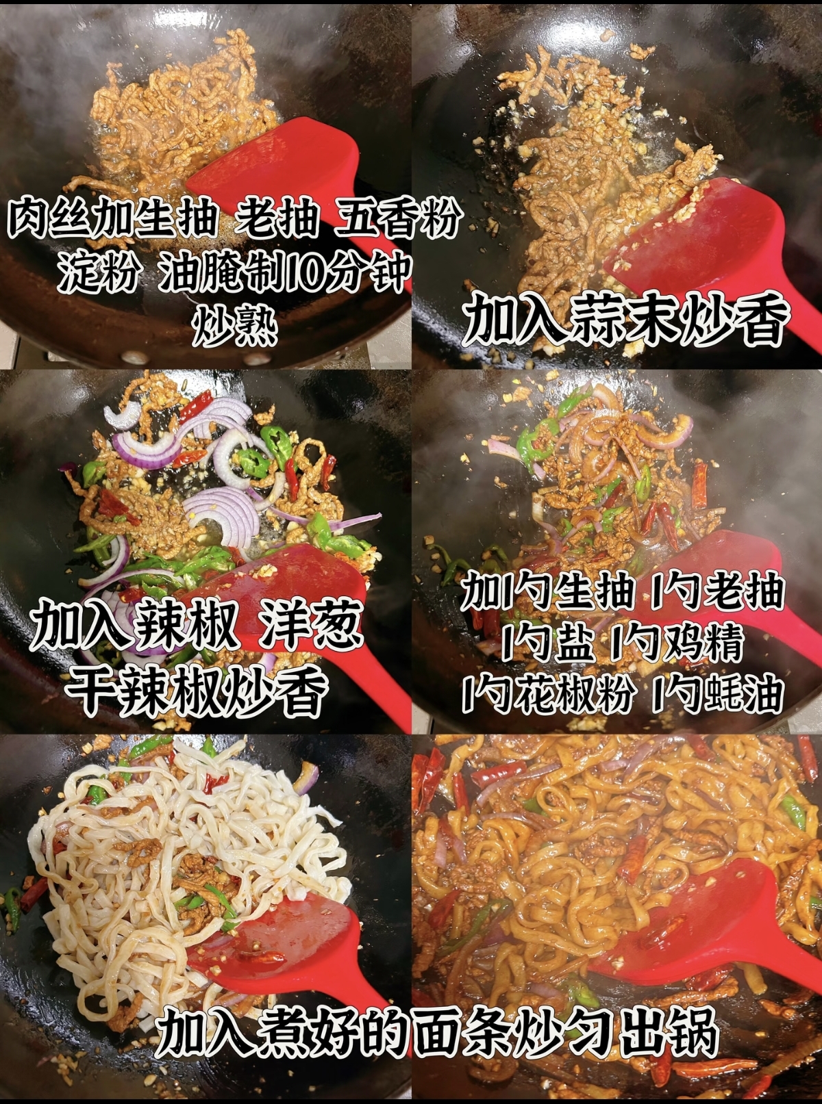 最后,将之前炒好的肉丝倒回锅中,与面条、配菜一同大火快炒,让所有食材的味道充分融合。根据个人口味加入适量盐调味,再翻炒几下即可出锅。一盘色泽诱人、香气扑鼻的香辣肉丝炒面就大功告成了。
