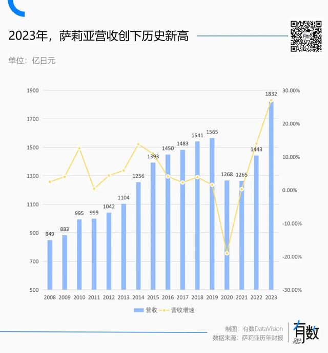 到了2023年,萨莉亚的营业收入直接飙升到1832亿日元,一举创下了历史新高。