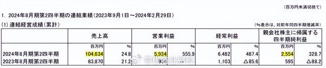 萨莉亚2024财年第二季度(2023年9月1日~2024年2月29日)的合并财报显示,报告期内萨莉亚营业利润达59.34亿日元,净利润还高达25亿日元,较上年同期增近6倍。