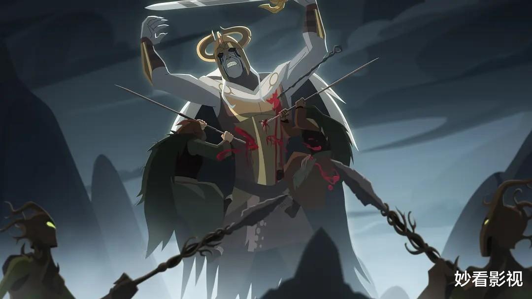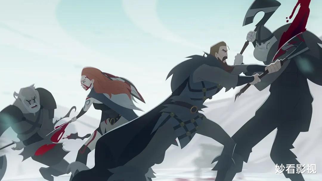 施奈德将他的视觉功力移植到动画领域,每帧画面都兼具力量感与艺术性。动画采用简约而锐利的2D风格,清晰的色彩分区、硬朗的线条轮廓,完美呈现了北欧神话的粗犷与神秘。冬日战场的白雪被鲜血染成暗红,阿斯加德的神殿高耸入云,光影交错间透着冷漠神性,冥界迷雾弥漫,发光的水晶与扭曲的河流构建出超现实的诡异氛围。