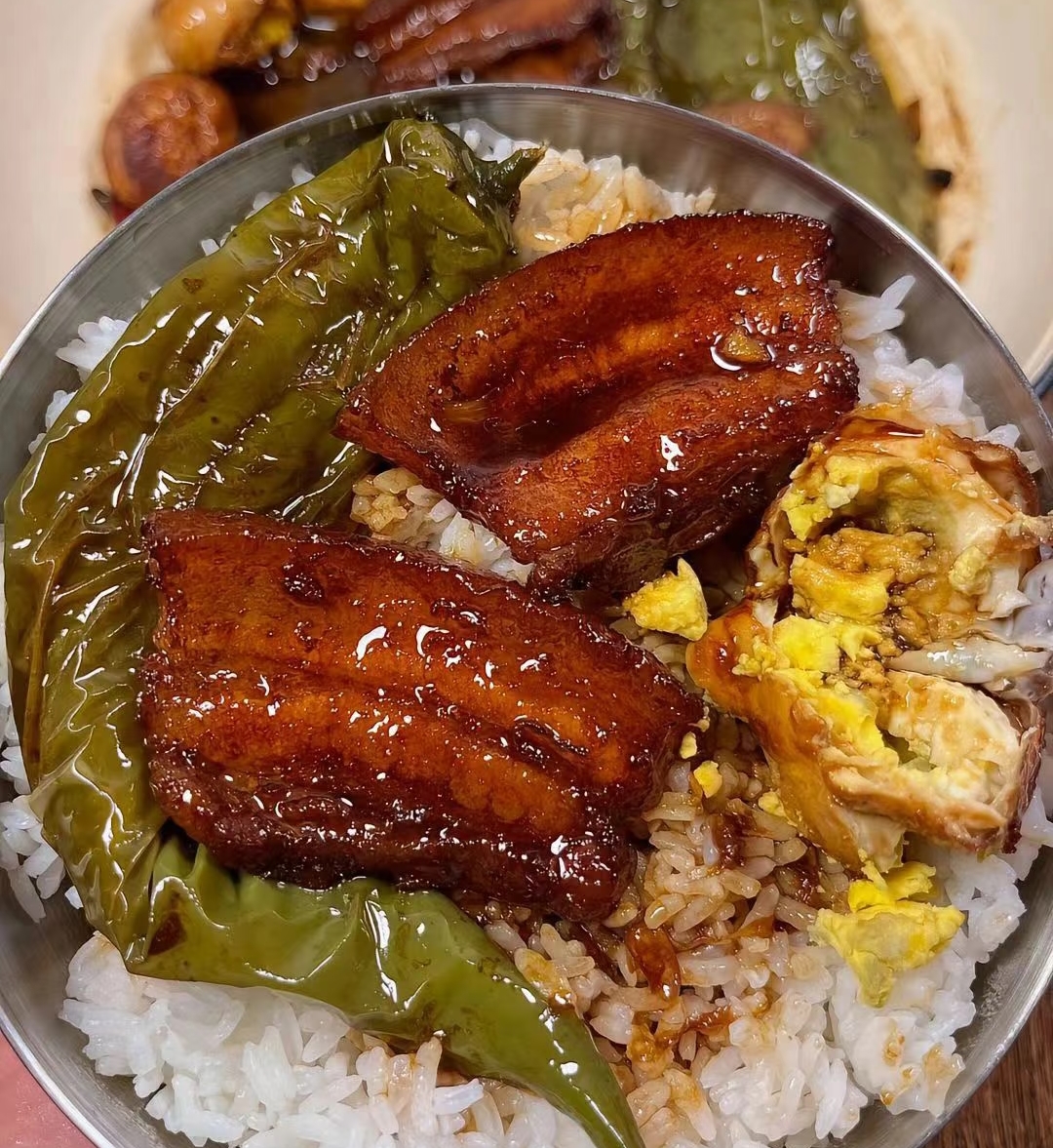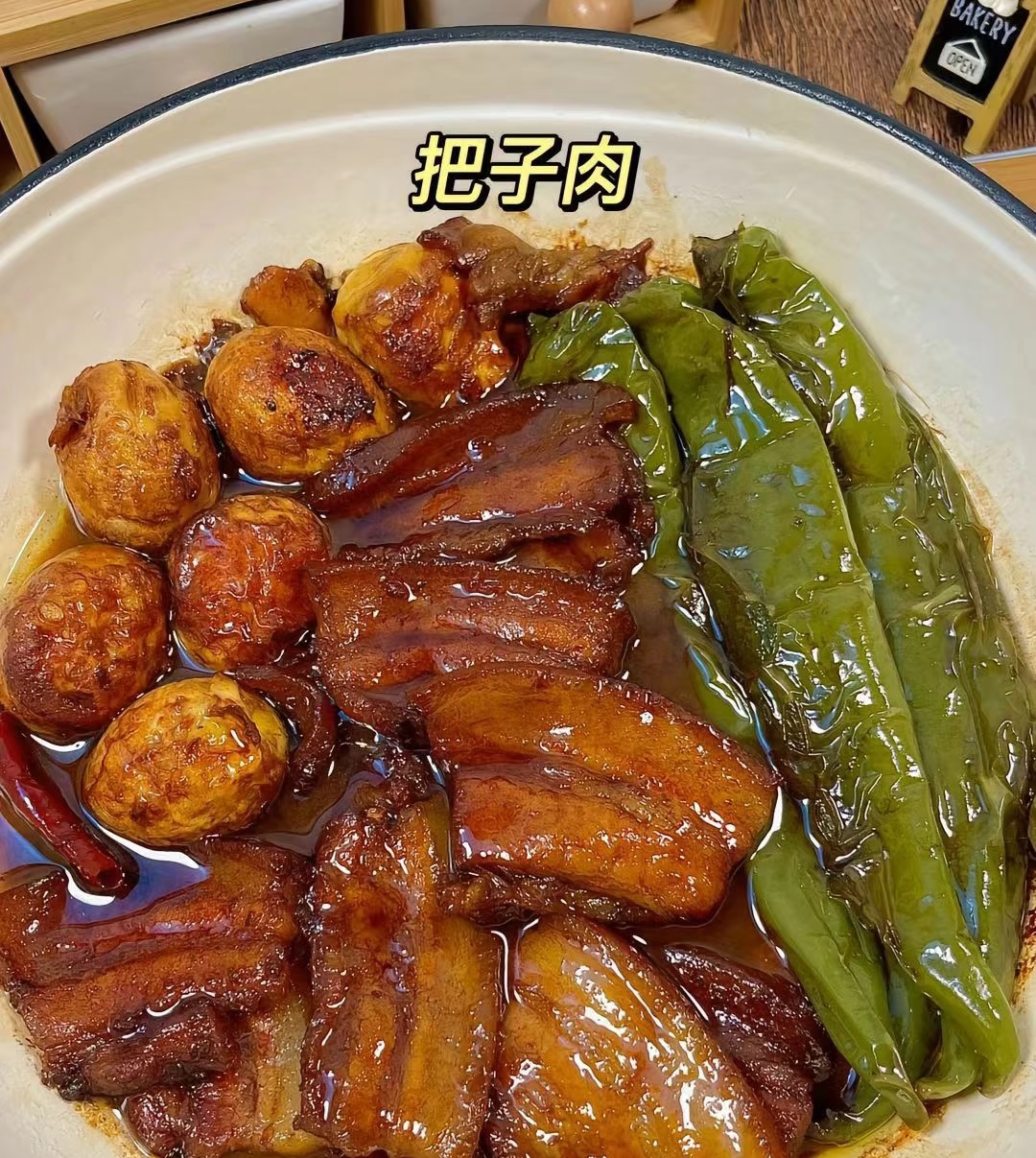 为了让把子肉达到“水晶”般的质感,炖煮的器皿与火候很有讲究。将翻炒好的肉连带汤汁一起倒入砂锅中,砂锅保温性好,受热均匀,最适合慢炖。加入足量的开水,没过食材,盖上盖子,用大火烧开后转中小火焖煮20分钟。时间一到,打开盖子,此时肉质已经半熟,我们将之前煎好的虎皮鸡蛋和青椒放入砂锅中,让它们浸入汤汁之下,盖上盖子继续焖煮15分钟。这最后的一刻钟,是食材风味融合的升华期,鸡蛋吸饱了肉汁,青椒中和了油腻,五花肉则变得软糯红亮。关火后,一锅热气腾腾、浓香四溢的水晶把子肉便大功告成,肉片颤巍巍地闪着油光,一口下去,肉烂味浓,确实是不可多得的家常美味。