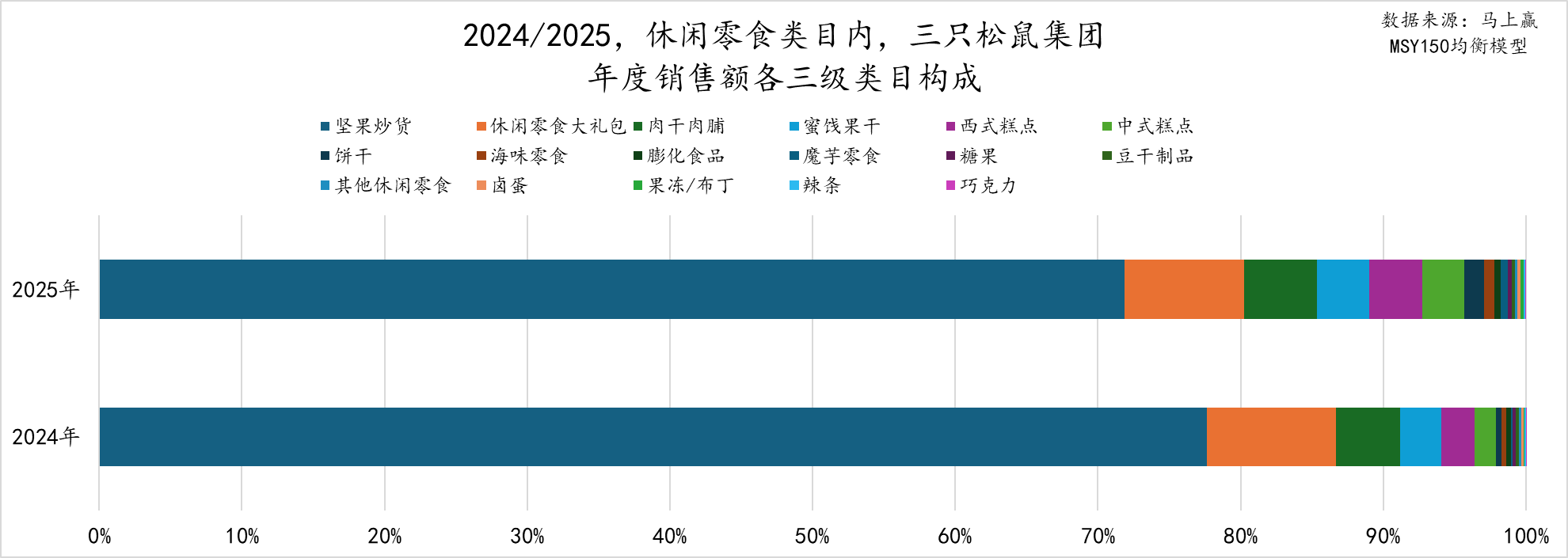 从三只松鼠集团在2025年的销售额三级类目占比来看,最主要的品类仍为坚果炒货,其占比超过70%但相较于2024年有所降低。相对的,肉干肉脯、蜜饯果干、西式糕点、中式糕点、饼干、海味零食、膨化食品、魔芋零食等类目的占比则都同比有所提升。这也或可说明2025年三只松鼠的销售额三级类目构成相较于2024年更趋多元,既体现出三只松鼠在休闲零食类目的野心与势头,也对其运营和管理能力提出了更高的要求。
