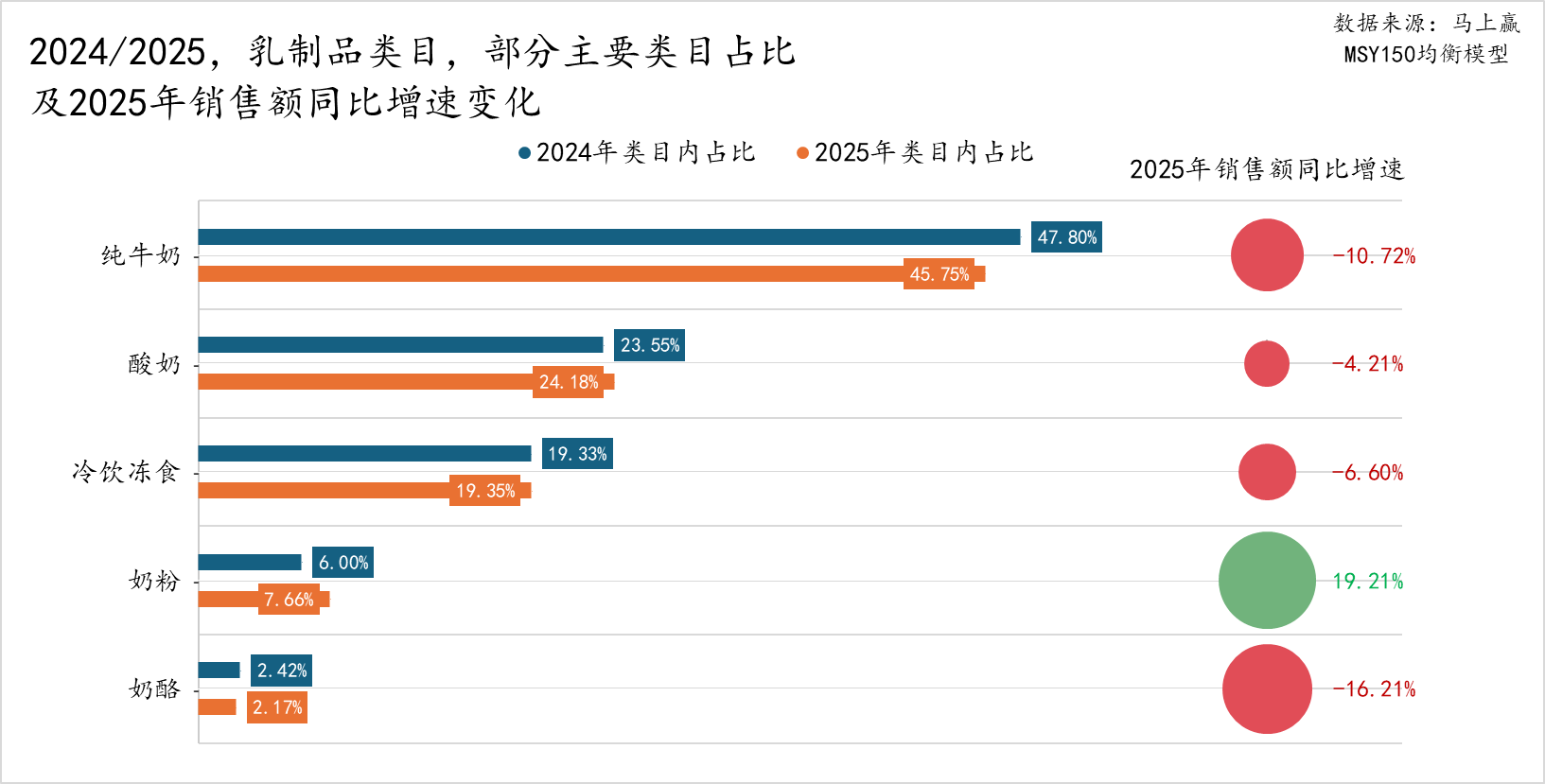 另两个类目---面向成年及中老年人更多的奶粉,以及面向少年儿童更多的奶酪,则呈现出截然相反的方向。其中,奶粉的占比有较为显著的提升,2025年的销售额同比增速也接近20%,或许与社会老龄化等因素有一定的相关性;相反,奶酪类目的销售额同比增速下滑超过15%,类目整体承压较为严重。