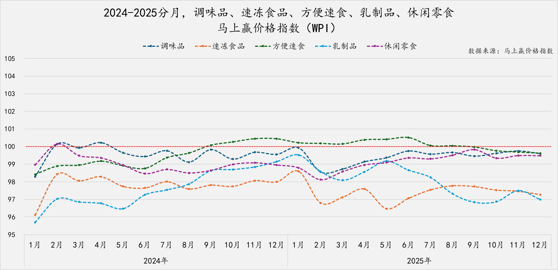 在过去两年几个类目的马上赢价格指数表现上,最显著的共性是除了方便速食在2024年9月到2025年7月指数超过100外,其余类目排除春节错位带来的影响,绝大多数时间价格指数均低于100,这也意味着除方便速食外的其他类目,近两年都有着较为显著的价格下行压力,尤其是速冻食品、乳制品,两年全年未超过100,整体在97-98上下徘徊波动。