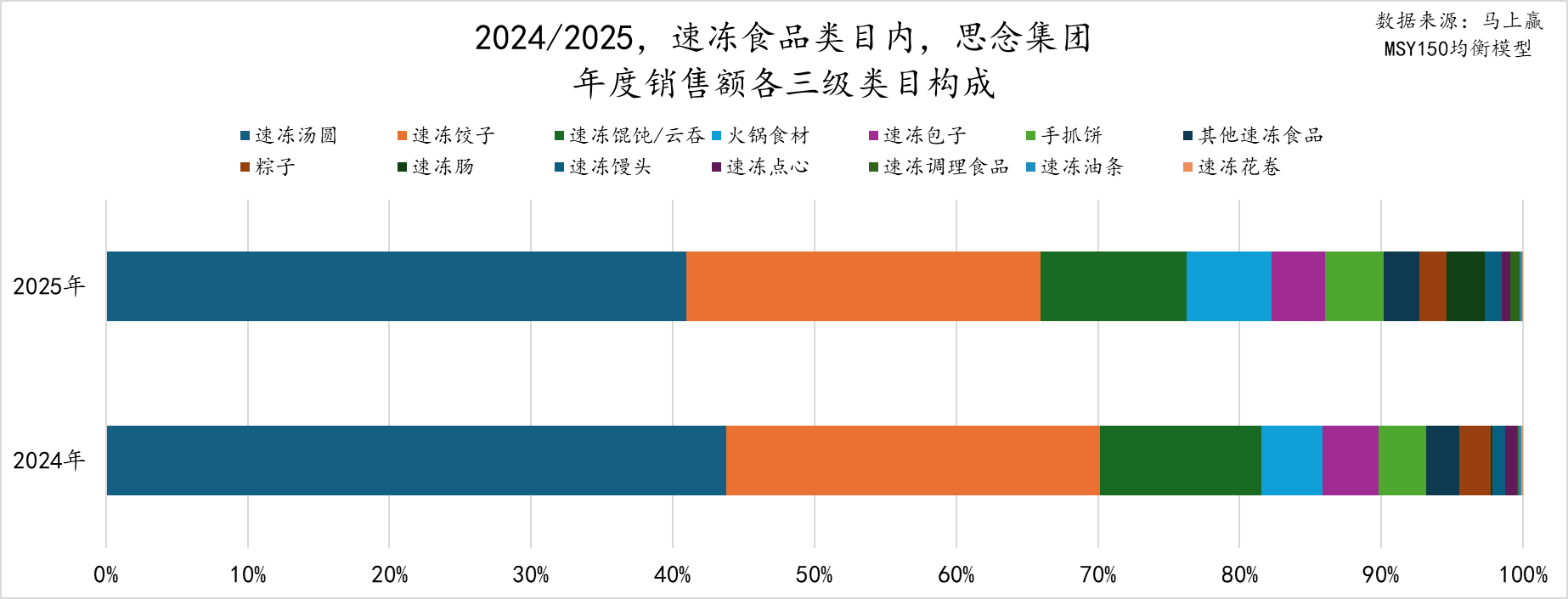 以传统速冻食品起家的思念,面对速冻食品类目整体产生的趋势变化也在积极进行调整。从2025年思念集团的销售额三级类目构成来看,速冻汤圆、速冻饺子、速冻馄饨/云吞仍为占比前三的类目,但三者相比2024年的占比都有所下降;而火锅食材、手抓饼、速冻调理食品等类目占比则显著提升。一方面,思念积极通过趣味汤圆、联名营销、场景细分等方式在传统品类不断推陈出新,守住具备品牌心智优势的基本盘;另一方面,思念也跟随类目整体与消费者的趋势变化,积极拓展新兴类目如火锅丸料、手抓饼、速冻肠等,不断调整结构,支撑集团的进一步增长。