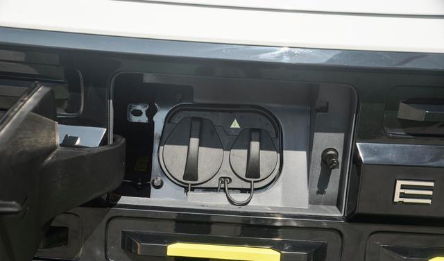 车头比较方正,黑色格栅和大灯结合在一起,形成了贯穿的视觉效果,还应用了亮色装饰条,中间位置盖板下面隐藏着充电口。
