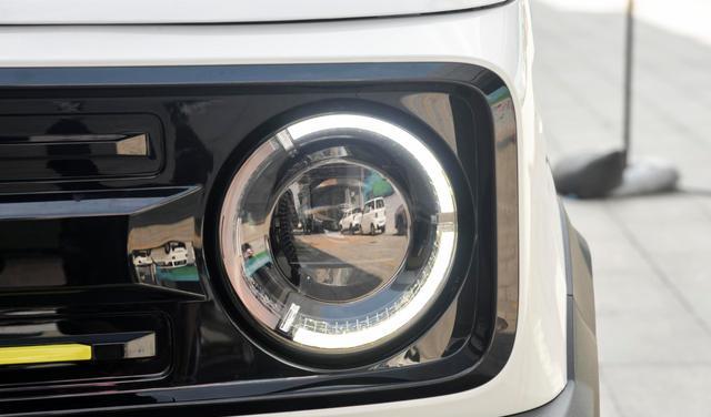 圆形的大灯复古又可爱,具有延时关闭功能,远近光是普通卤素光源的,C状的日间行车灯使用了LED光源,另外厚重的前包围增加了一定的野性。