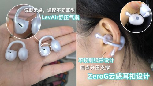 该耳机采用U型耳环+弹性夹持的组合设计,单耳重约7.3克,液态硅胶材质不仅耐磨,还无扬声孔;同时依托人体工学设计搭配记忆钢丝,能紧密贴合耳廓,做到狂甩不掉,即便长时间佩戴也无疲劳感,就算戴头盔、眼镜也能正常使用。