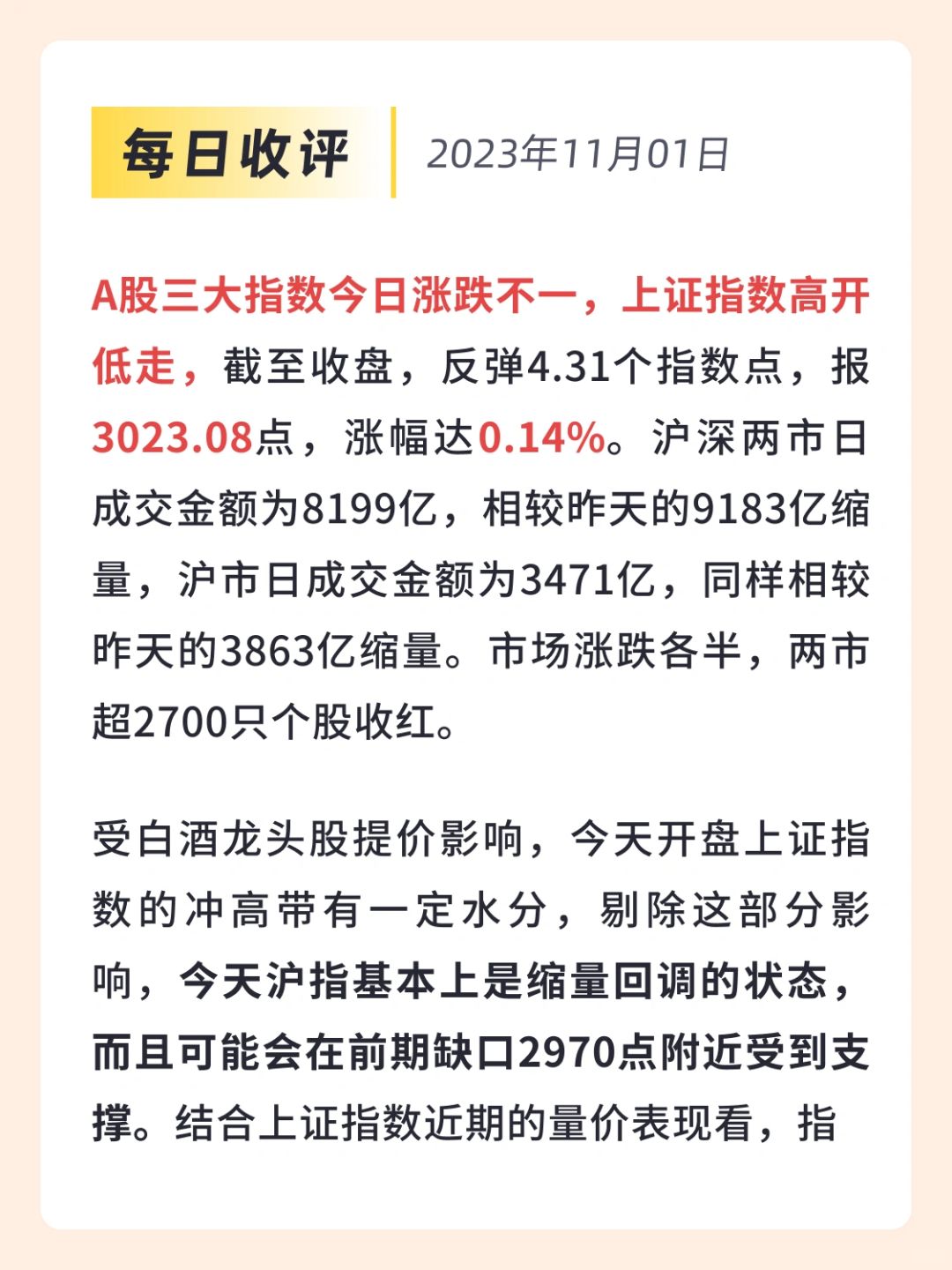 [向右R]A股三大指数今日涨跌不一,上证指数高开低走,截至收盘,反弹4.31个指数点,报3023.08点,涨幅达0.14%。沪深两市日成交金额为8199亿,相较昨天的9183亿缩量,沪市日成交金额为3471亿,同样相较昨天的3863亿缩量。市场涨跌各半,两市超2700只个股收红。