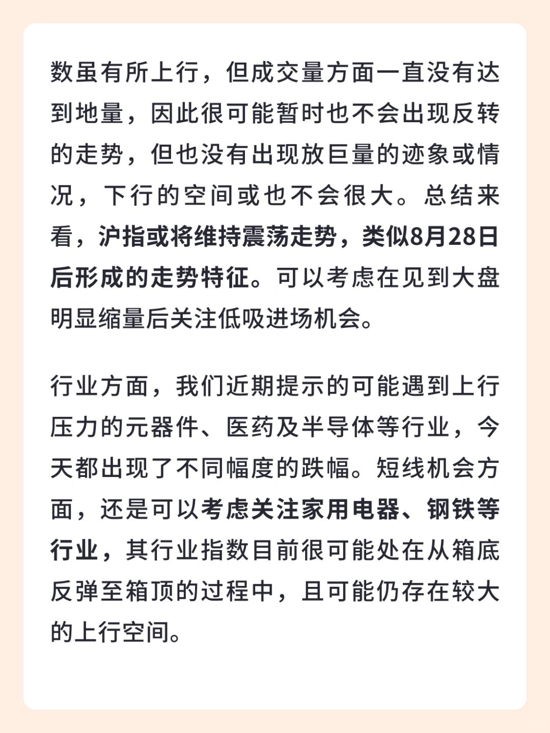 [向右R]受白酒龙头股提价影响,今天开盘上证指数的冲高带有一定水分,剔除这部分影响,今天沪指基本上是缩量回调的状态,而且可能会在前期缺口2970点附近受到支撑。结合上证指数近期的量价表现看,指数虽有所上行,但成交量方面一直没有达到地量,因此很可能暂时也不会出现反转的走势,但也没有出现放巨量的迹象或情况,下行的空间或也不会很大。总结来看,沪指或将维持震荡走势,类似8月28日后形成的走势特征。可以考虑在见到大盘明显缩量后关注低吸进场机会。