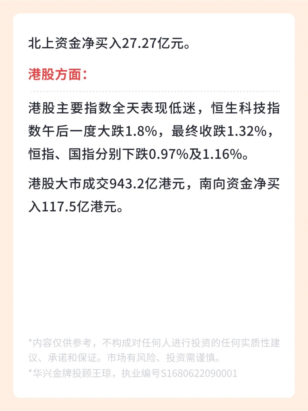 👉 港股主要指数全天表现低迷,恒生科技指数午后一度大跌1.8%,最终收跌1.32%,恒指、国指分别下跌0.97%及1.16%。